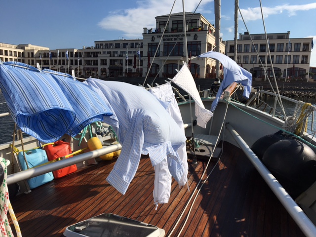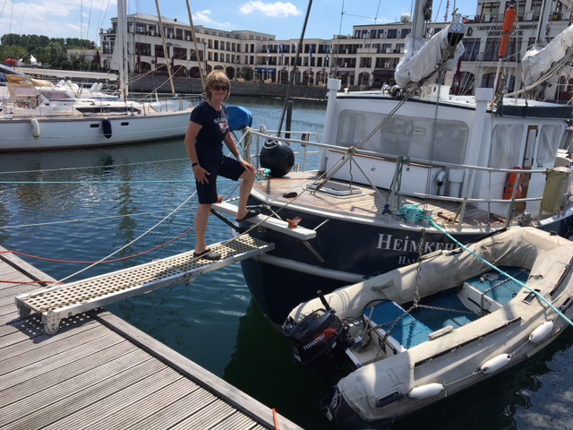 ….nennt man es wenn das Schiff mit in dem Heck zur Pier liegt. Vorne dann meistens zwei Dalben oder eine Mooring. Für uns nicht so einfach weil wir vorne einen langen Klüverbaum und hinten ein Beiboot haben. Hier in Hohe Düne geht es nicht anders das Beiboot wird an die Seite geschwenkt und achtern gehen wir über eine Gangway an Land. Die hatten wir zuletzt in Las Palmas benutzt. Sea U Bert