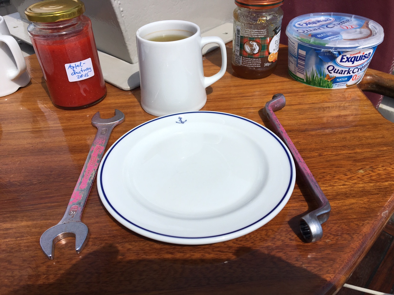 Hohe Düne. Lenis Reparatur am Aussenborder des Beibootes war erfolgreich. Heute Morgen haben wir eine umfangreiche Probefahrt mit inkludiertem Badevergnügen gemacht. Maschine läuft wie ein Uhrwerk. Zur Belohnung habe ich ihr dann den Frühstückstisch gedeckt. Artgerecht. Morgen früh wollen wir weiter Richtung Stralsund. Sea U Bert