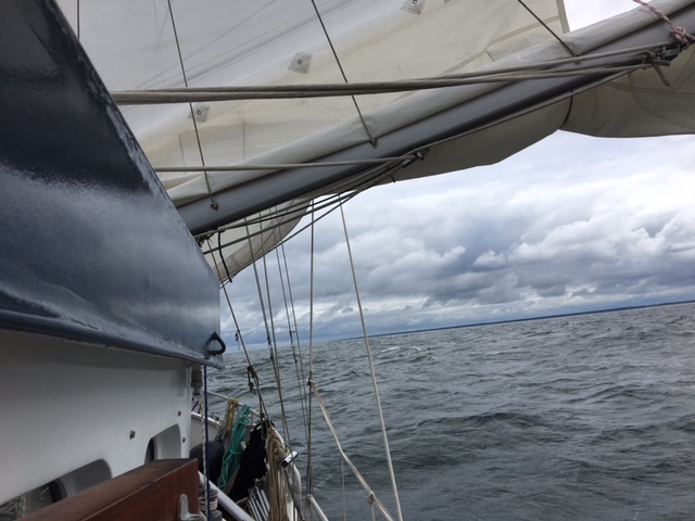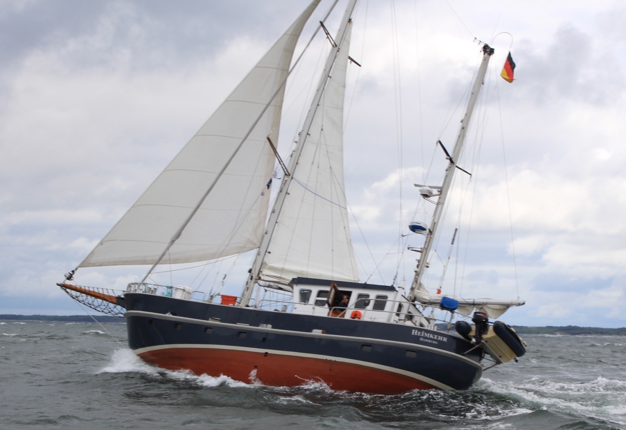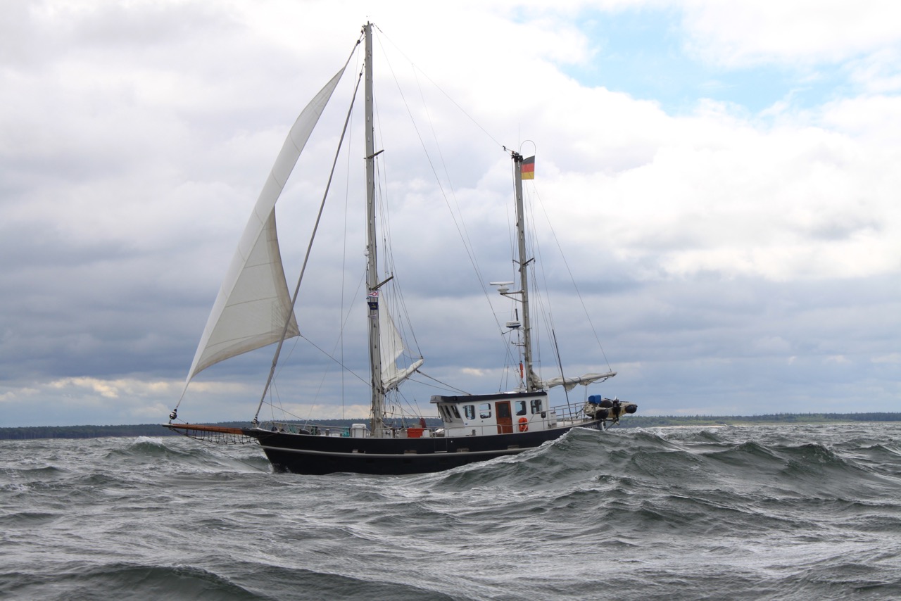 In See. Heute Morgen sind wir um 8:00 Uhr ausgelaufen von Hohe Düne Richtung Stralsund. Das sind etwa 55 Meilen. Leider steht hier draußen noch eine blöde See von gestern. Also kein Sonntagsvergnügen. Sea U Bert