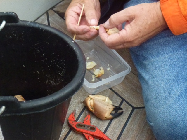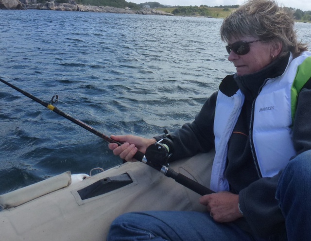 Den kämpft hier die Maschinistin. Ok, heute hat sie sechs kleine Makrelen gefangen, die nach dem Filetieren in Soya gebeizt auf der Haut gebratbacken wurden. Unser Grill hat einen Deckel, da geht das gut und der Geruch bleibt an Deck. Nachdem sie nun sehr erfolgreich war in letzter Zeit beim Makrelenangeln, hab ich nur noch einen Wunsch: Würstchen oder irgendwas mit Kartoffeln und Soße. Sea U Bert