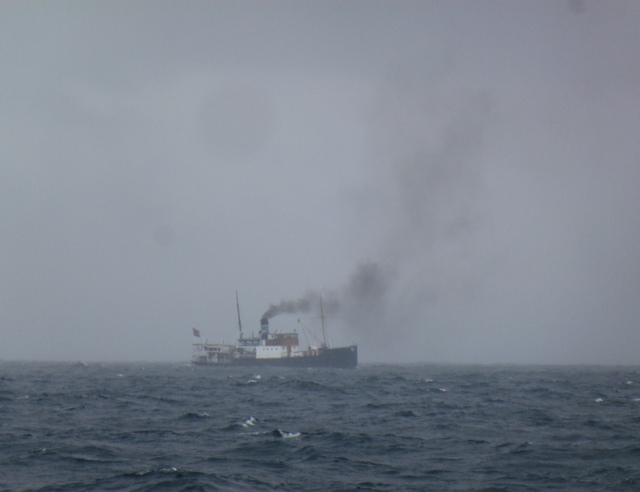 Gibt’s gar nicht! Wir treffen einen richtigen alten Küstendampfer.