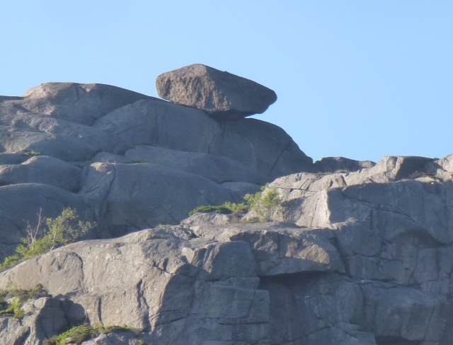 Ana Sira. Unser Lieblingsfjord. Alles da, rundum Berge, hübsche Häuser, Wiesen und ein geschützter Ankerplatz. Das Haus, vor dem wir liegen, finden wir etwas bedroht. Dieser etwa 10 m lange Wackelstein liegt direkt darüber. Sea U Bert