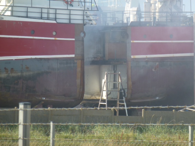 Thyborön. Großalarm bei den Feuerwehren der Umgegend, auf dem grönländischen Kutter Claudia ist ein heftiges Feuer ausgebrochen. Das Schiff ist auseinander geschnitten, weil es verlängert werden soll. Niemand ist verletzt worden, das 100m in Lee liegende Tanklager blieb verschont.. Sea U Bert
