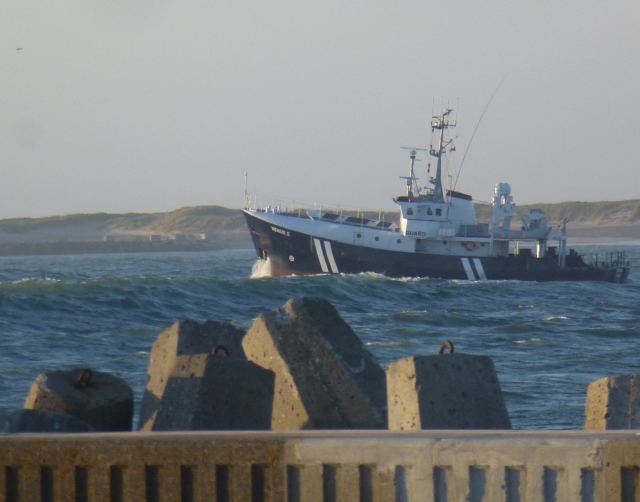 Der Thyboroen-Kanal ist ein gefährliches Gewässer. Das hier auslaufende Schiff ist ein zum Wachschiff umgebauter Fischdampfer. Die passen in der Nordsee bei den Bohrplattformen auf, dass denen niemand zu Nahe kommt. Und das bei jedem, jedem Wetter. Da ist so ein Fischdampfer mit praktisch unbegrenzter Seefähigkeit genau das richtige. Morgen am Samstagnachmittag wollen wir auslaufen, durch diese Ausfahrt. Wir hoffen, das wir dann 24 Stunden später in Norwegen sind. Sea U Bert