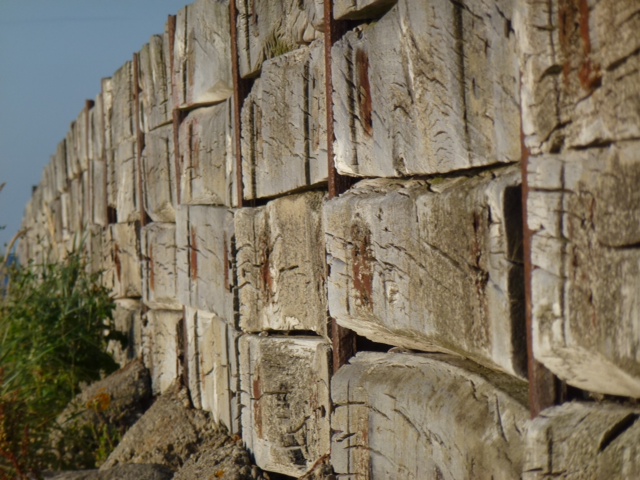 Hafenmauer aus Eisenbahnschwellen.