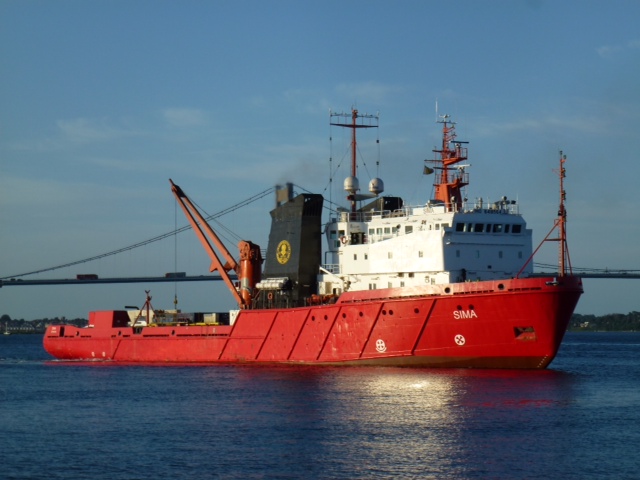 Middelfart. Dieses ehemals russische Spezialschiff ist Teil einer kleinen Flotte, die hier im Kleinen Belt ein Starkstromkabel legt. Diese Strippe wird die Hauptverbindung zwischen Jütland und den Inseln. Heute wird der Strom mit gigantischen Hochspannungsleitungen transportiert. Das Kabel ist 25 cm dick und wird einen Meter tief in den Grund gespült.. Die Sima ist darauf spezialisiert, solche Kabel auch in großen Tiefen einzuspülen. Der Kleine Belt ist hier bis 35 m tief. Vorher hat die Sima ein Kabel in Grönland verlegt. Sea U Bert