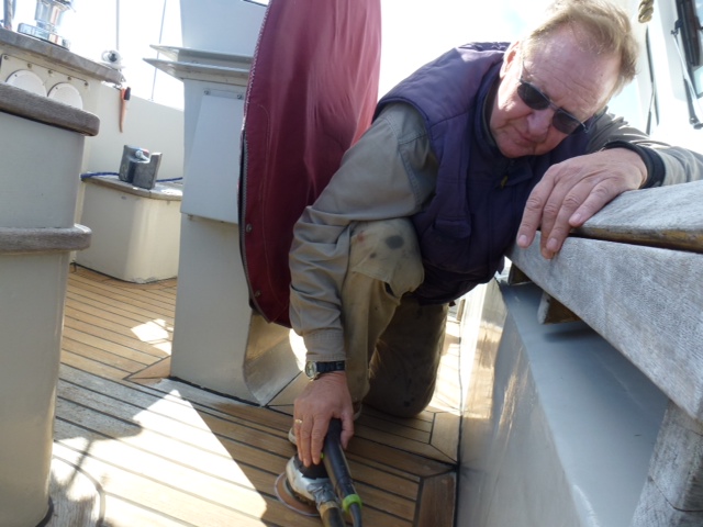 In See. Wenn gutes Wetter ist wird gearbeitet. Auch wenn wir auf See sind, oder gerade dann. Soviel anderes ist ja nicht zu tun. Zur Zeit schleifen wir das Deck. Und wenn wir so weiter machen, werden wir bald ‘n piekfeines Schiff.. Sea U Bert