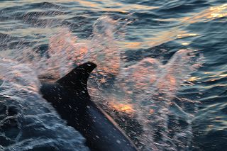 In See, 68 Meilen bis Fair Isle. Bei Sonnenaufgang unb pünktlich zum Wachwechsel sind sie da! Erst nur eine Finne weiter weg, dann preschen sie heran und gucken mal, wer da in ihrem Revier rumschippert. Sechs große Tiere (Common Dolphin) inspizieren das Unterwasserschiff und das neue Antifouling. Und schwimmen mit Heimkehr um die Wette. Auch wenn wir das Rennen verloren haben: dies wird ein guter Tag!