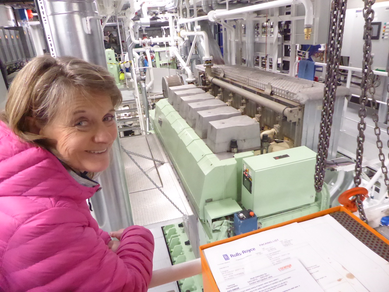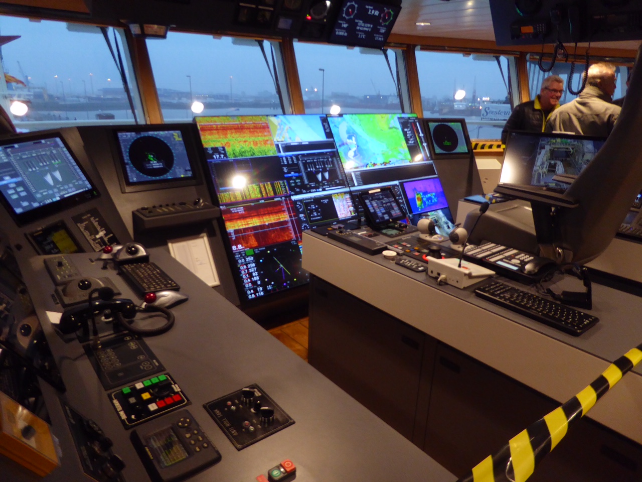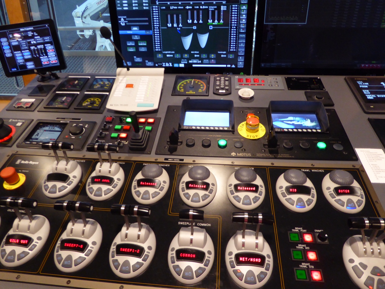 Cuxhaven. Da strahlt die Maschinistin: 5600kw 6 Zylinder Diesel. Das ‘Cockpit’ und als letztes Bild das Bedienpult für die Netzwinden. Wir haben nur gestaunt. Das Schiff heißt Cuxhaven und fährt für die DFFU Deutsche Fisch Fang Union, eine Isländische Reederei.