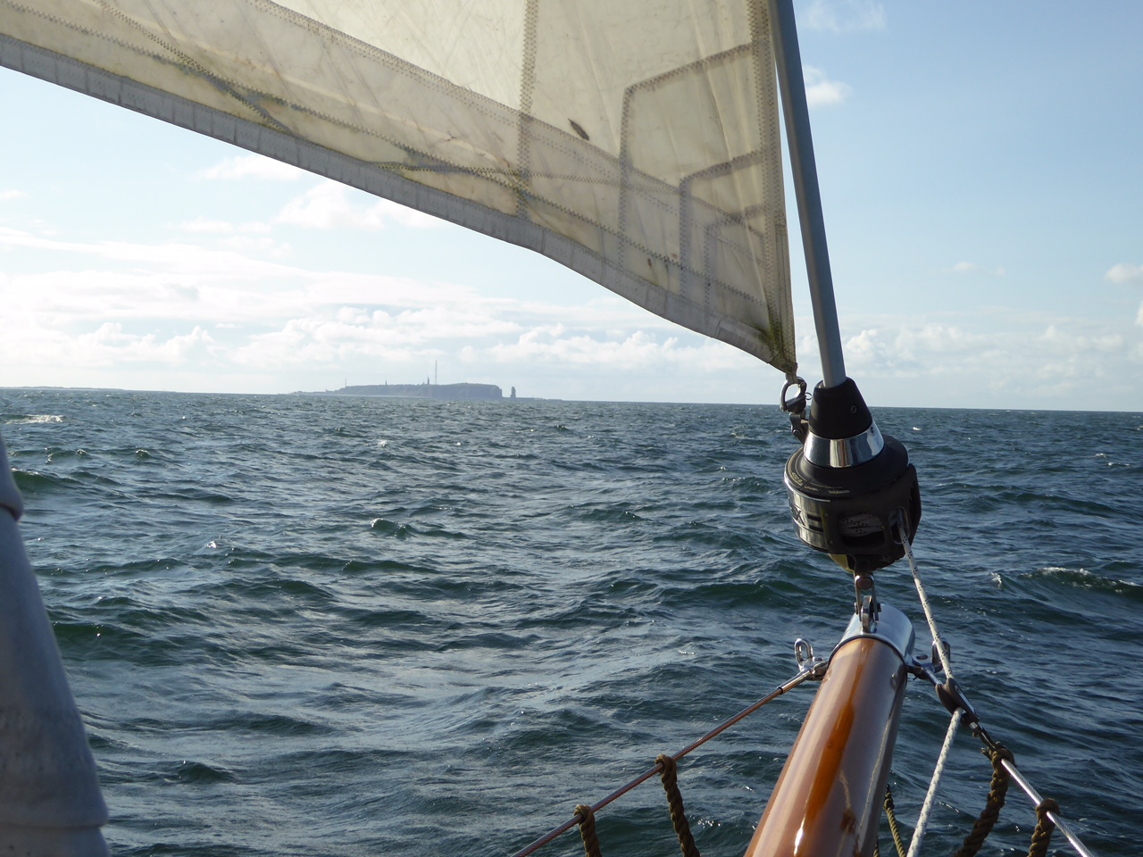 In See. Der neuste Wetterbericht hat es bestätigt: Wind, Richtung, Welle – alles passt für Helgoland. Um 15.30 Uhr legen wir ab in Farsund, setzen Besan und Groß und motoren durch die Felsen ins freie Wasser. Motor aus, Klüversegel ausrollen, hier und da noch etwas an den Segeln zupfen und schon läuft Heimkehr mit bis zu 6,5 Knoten durch die Nordsee. Je nach Tide schiebt der Strom mit und bringt uns manchmal auf fast 7 Knoten. Rennziege, sag ich doch! Das Schaukeln ertragen ist ganz ok, wir sind wohl durch die letzten Wochen drauf eingestellt. Allerdings bleibt die Küche kalt, Butterbrote schmecken auch. Telefon und i-Pad bleiben irgendwann auch kalt – kein Netz mehr. Mal sehen, wie mein Skipper das erträgt.