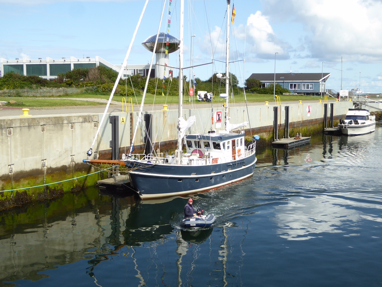 In See. Die Nacht war lang, es wird früh dunkel und spät hell. Die norwegischen hellen Nächte sind endgültig vorbei. Hinzu kamen dicke Regenwolken und Gewitter. Wir haben riesige Windparks passiert, unglaublich, welche Mengen Windräder hier in der Nordsee stehen. Die nehmen den armen Seglern den Wind weg, jetzt weiß ich’s. Wir mussten die ganze Nacht den Motor mitlaufen lassen, sonst wäre wahrscheinlich erst Sylt in Sicht. Ich bin noch nie von Norden auf Helgoland zugelaufen, schöner Anblick. Die Sonne scheint, wir werden uns jetzt landfein machen und uns eine Pütz Nordseewasser über den Pelz schütten. Und dann mal sehen, ob wir noch leckere Brötchen vom Inselbäcker ergattern können. All’s well + happy on board – Marlene