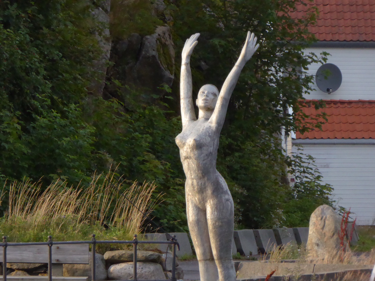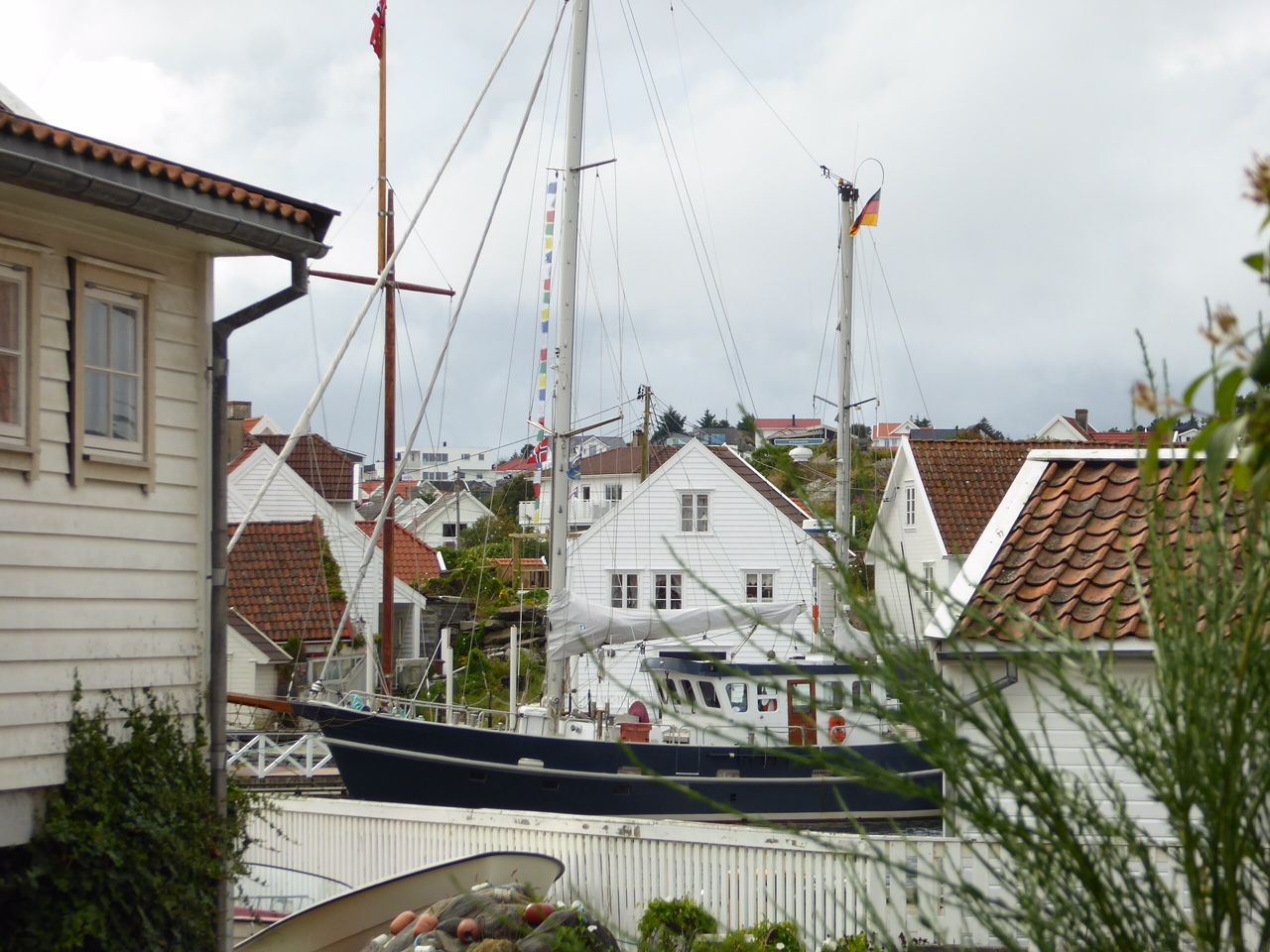 Hier liegen wir auf dem Dorfplatz. Rundherum hübsche weiße Häuser. Gestern hatten wir das Gegenteil, lagen vor einer verfallenen Fabrikruine in einem total langweiligen Dorf. Hier in Skudeneshavn hat es sogar aufgehört zu regnen. Morgen wollen wir versuchen, nach Egersund zu kommen, gut 50 Meilen weiter südlich.