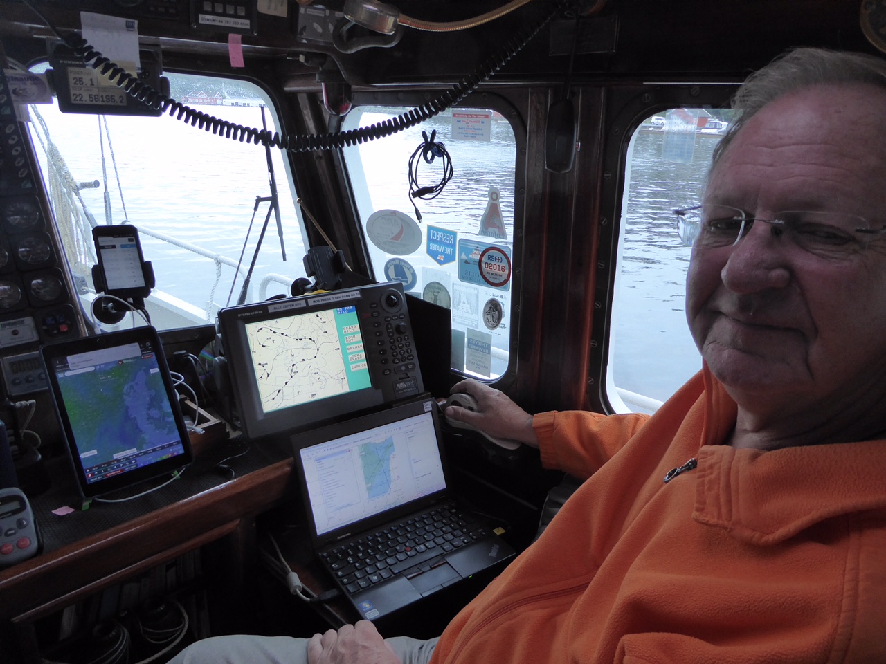 Farsund. Die 240 Meilen bis nach Helgoland sind kein Kinderspiel. Wir bereiten uns, was das Wetter angeht, so gut wie irgend möglich vor. Natürlich sind auch genügend Kekse und Schokolade an Bord! Jede Wetterinformation, die wir kriegen können, wird tagelang studiert. Wenn’s dann um die Entscheidung geht, dann hören wir immer auf Wetterwelt. Heute sieht es so aus, als wenn wir am Freitagmittag auslaufen. Und wenn alles klappt, essen wir zwei Tage später echte Helgoländer Brötchen. Sea U Bert