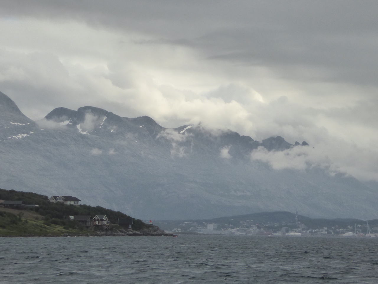Sandnessjøen. Regen und Nebel. Die Bergkette ‘Die sieben Schwestern’ ist kaum zu erkennen. Wir sind’s nicht mehr gewohnt nach dem herrlichen Sommerwetter in der Arktis. Die haben wir nun gestern verlassen, und prompt meldet sich die Kühlbox, ihr ist zu warm. Oder sie hat das Gletschereis nicht vertragen, da war ihr zu kalt. Wir werden dem Kühlkompressor eine Portion Kältemittel verpassen, dann geht’s ihm sicher wieder besser. Hier gibt’s jede Menge Schiffsreparierer, bestimmt auch einen für Kühlboxen mit Hitzewallungen.