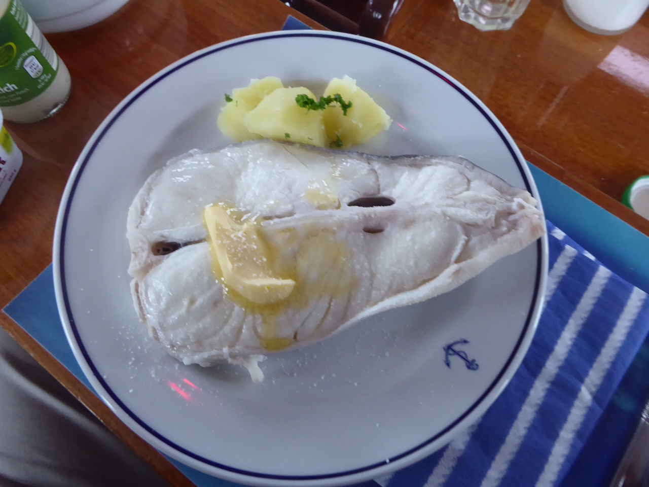 Brønnøysund. Erstmals fanden wir einen Fischladen. Dies ist Kweite, Heilbutt. Kartoffeln Butter, Salz, fertig. Ein wunderbarer Fisch. Sea U Bert
