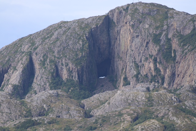 Außer den sieben nackerten Mädels gab es noch eine achte, die hieß Lekamøya. Die fand der Hestmannen (Pferdemann) lecker. Er hinterher und kriegte sie nicht. Da nahm er einen Pfeil in seinen Flitzebogen und … als der Pfeil sich löste, warf der König, der stand da so rum, seinen Hut in die Flugbahn des Pfeils und rettet ihr das Leben. Und wieder wurde es hell und alles versteinerte. So liegt nun der Hut da mit dem Loch drin.. Das Loch ist heute 160 m lang und 30m hoch und auf dem dem Bild knapp zu sehen.