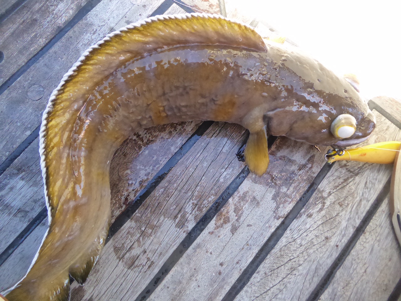 In See. Den kannten wir auch noch nicht. Lumb heißt er oder in lateinisch Brosme Brosme, er ist verwandt mit den Dorschen. Das Fischbuch sagt er sei lecker, wir prüfen das morgen nach. Leni hat ihn in 100 m Tiefe erwischt. Sea U Bert