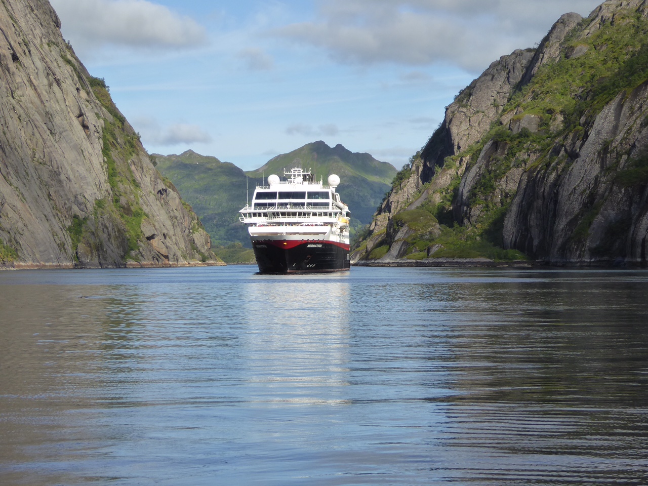 Trollfjord. Die kleineren Kreuzfahrtschiffe und die Hurtigdampfer zeigen ihren Passagieren gern dieses Ende der Welt. Der Fjord ist hier etwas breiter, so dass die Schiffe drehen können. Sea U Bert