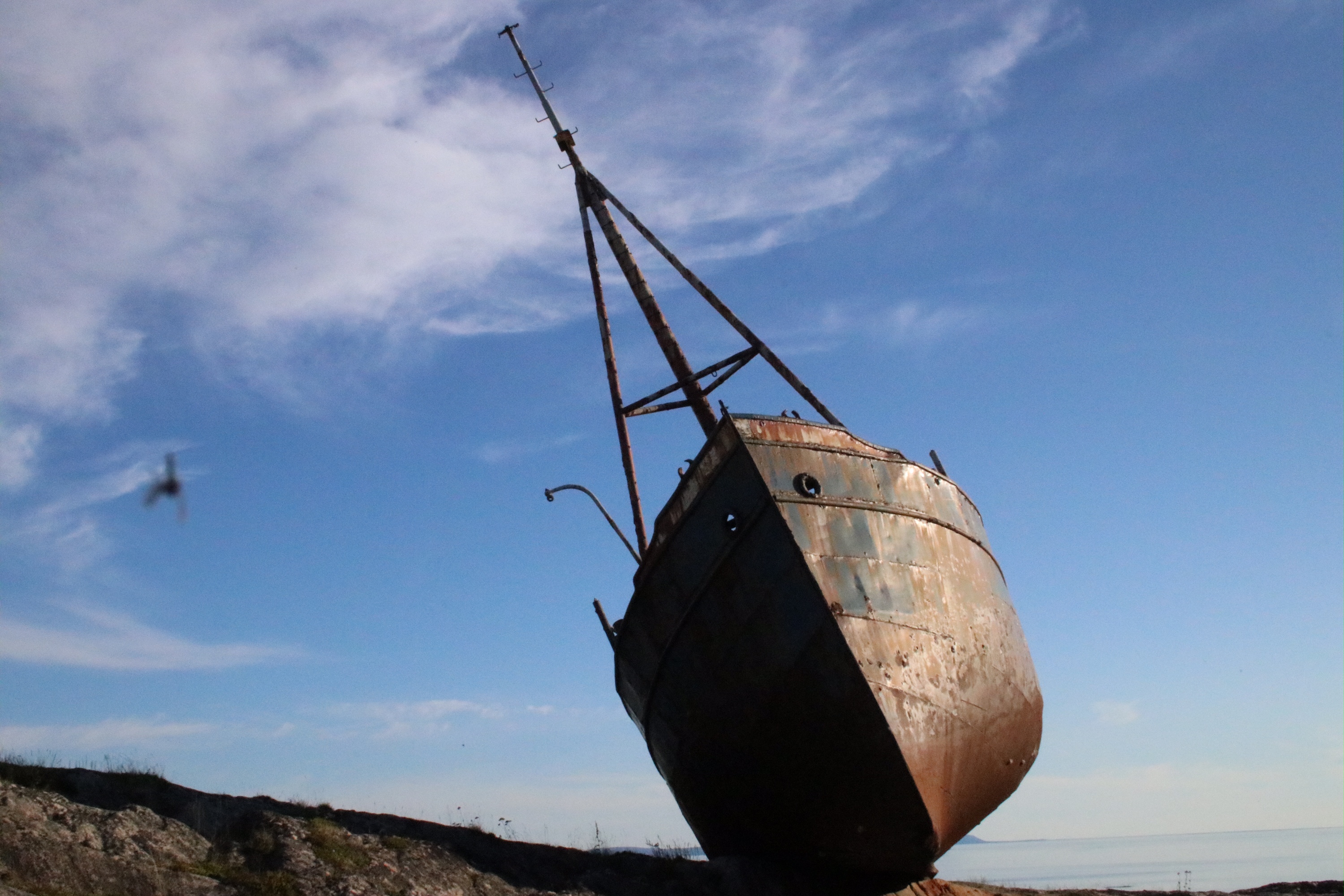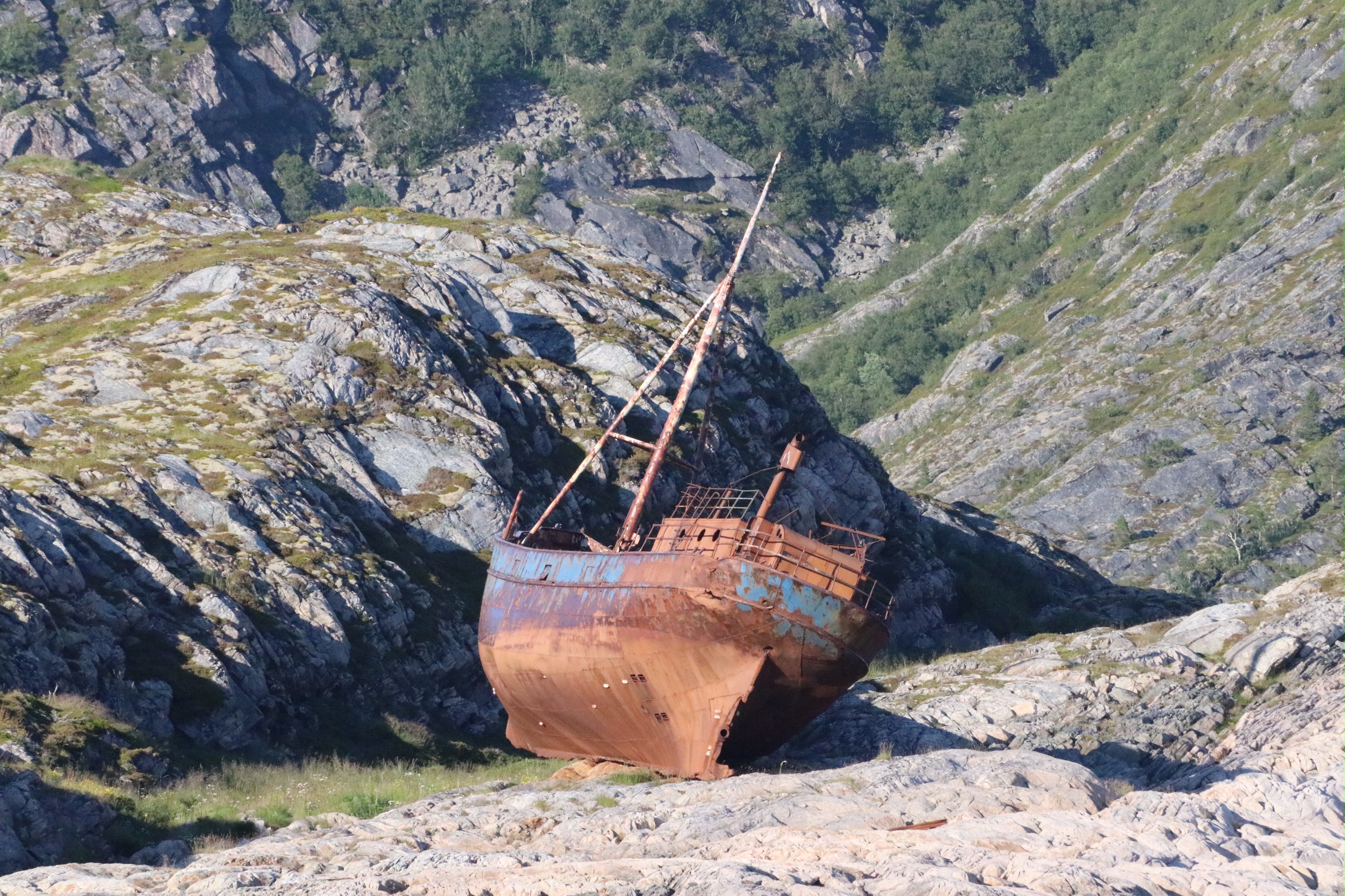 Barøy. Wir haben Bilder davon im Küstenschifffahrtsmuseum in Wischhafen gesehen. Da wollten wir hin, im Eingang zum Ofotjord, an dessen Ende Narvik liegt. Wir haben das Wrack gefunden, hoch und trocken, und geheimnisvoll. Sea U Bert