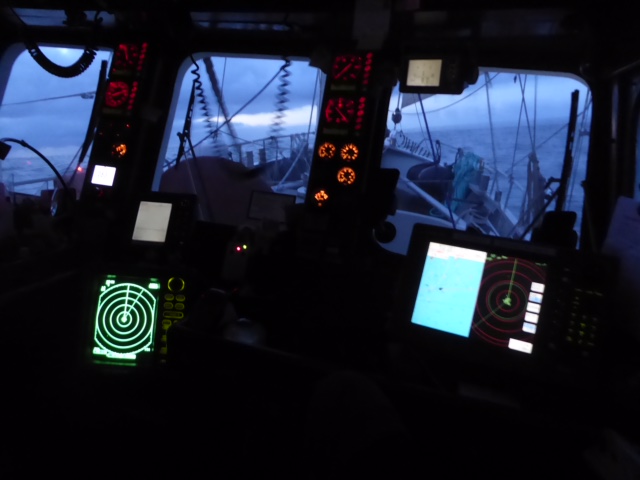 Heute Nacht ist es überhaupt nicht dunkel geworden. Als ich um eins die Segel dichter nehmen musste, ging das ohne Decksbeleuchtung. Jetzt um halb drei morgens ist es praktisch hell draussen. Der Wind ist ganz eingeschlafen, die See leider nicht, wir haben vom letzten Sturm noch eine Dünung von 2,5 m. Die hält uns gut in Bewegung.