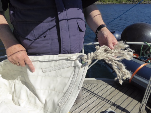 Vor der norwegischen Küste läuft manchmal ein tüchtiger Strom nach Norden, von Nord-Osten kam der Wind. Aber die vorhergesagten 20 Knoten, in Böen 26, wurden 50 Meilen vor der Küste zu steten 26 Knoten, die Böen zu 37, das sind 8 Beaufort. Das Vorsegel nur noch ein Taschentuch, das Großsegel im 3. Reff, die Schothornbefestigung am Besansegel abgerissen … und die Nordsee kochte, Strom gegen Wind ist schon auf der Elbe zum Kotzen! Und dazu kommt die nahende Küste mit abnehmender Wassertiefe. Um es vorwegzunehmen: wir haben uns absolut sicher gefühlt, aber wenn die Welle bei Heimkehr über die Reling kommt, dann ist das kein Spaß mehr. Mein Skipper hat diese letzte Wache übernommen und mich sicher durch die Klippen in die ruhige Ankerbucht gebracht. Der Landfall und dann die plötzliche Ruhe – genau deshalb werfen wir immer wieder die Leinen los.