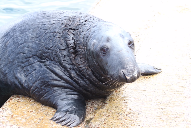 Lerwick. Die Hafenrobbe heißt hier Anneliese. Sie ist heute etwas traurig, weil die erst vier Fische gefangen hat. Sie ist dann zu uns auf die Pier gewupst aber wir hatten keinen einzigen Hering für sie. Die mit der Tomatensoße möchten wir nicht anbieten.
