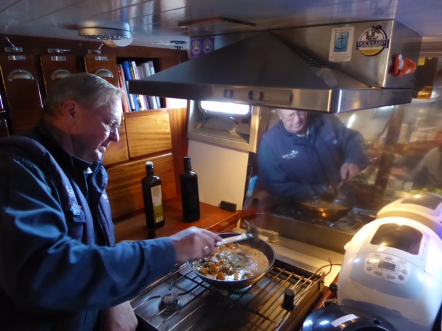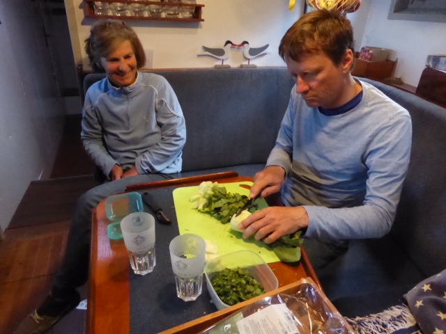 Lerwick, Shetlands. Wenn’s draußen stürmt und regnet, wird’s zu Hause gemütlich. Wir kochen mit Christine und Thomas von der ‘NOE’ (toller Blog mit super Fotos www.segeln-und-klettern.de). Thomas ist der beste Schnippler überhaupt. Voll konzentriert wird das Gemüse zerlegt und Bert hat überhaupt keine Arbeit mehr, ein super-leckeres Rindfleisch-Curry zu zaubern. Christine und ich lassen uns verwöhnen, die Männer machen das schon! Lecker 😋 Marlene