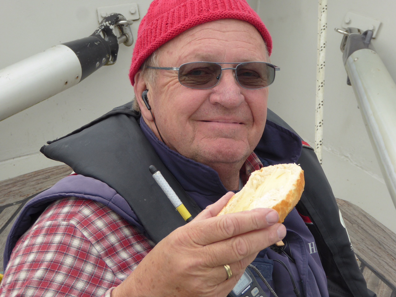 In See. 180 Seemeilen nordwestliuch von Helgoland, 271 Seemeilen to go bis Fair Isle. Aller Anfang ist schwer, und Seebeine wachsen langsam. Daran werden wir heute wiedermal erinnert. Heute morgen wurde es deutlich ruppiger obwohl wir nur 5 Windstärken haben. Heute nacht soll ein Trog (Ausläufer) des Tiefs, das über Nordirland liegt, uns hier streifen. Deswegen haben wir tchtig Gas gegeben um ihm wegzulaufen. Eigentlich sind alle Bedingungen gut, trotzdem fällt uns alles etwas schwer. Nach unserer Erfahrung müsste morgen alles besser werden mit uns. Unsere Mahlzeiten sind spärlich, heute gab es wieder Reis, mit wenig dazu. Zum Kochen unter Deck haben wir beide keine grosse Lust. sea U Bert