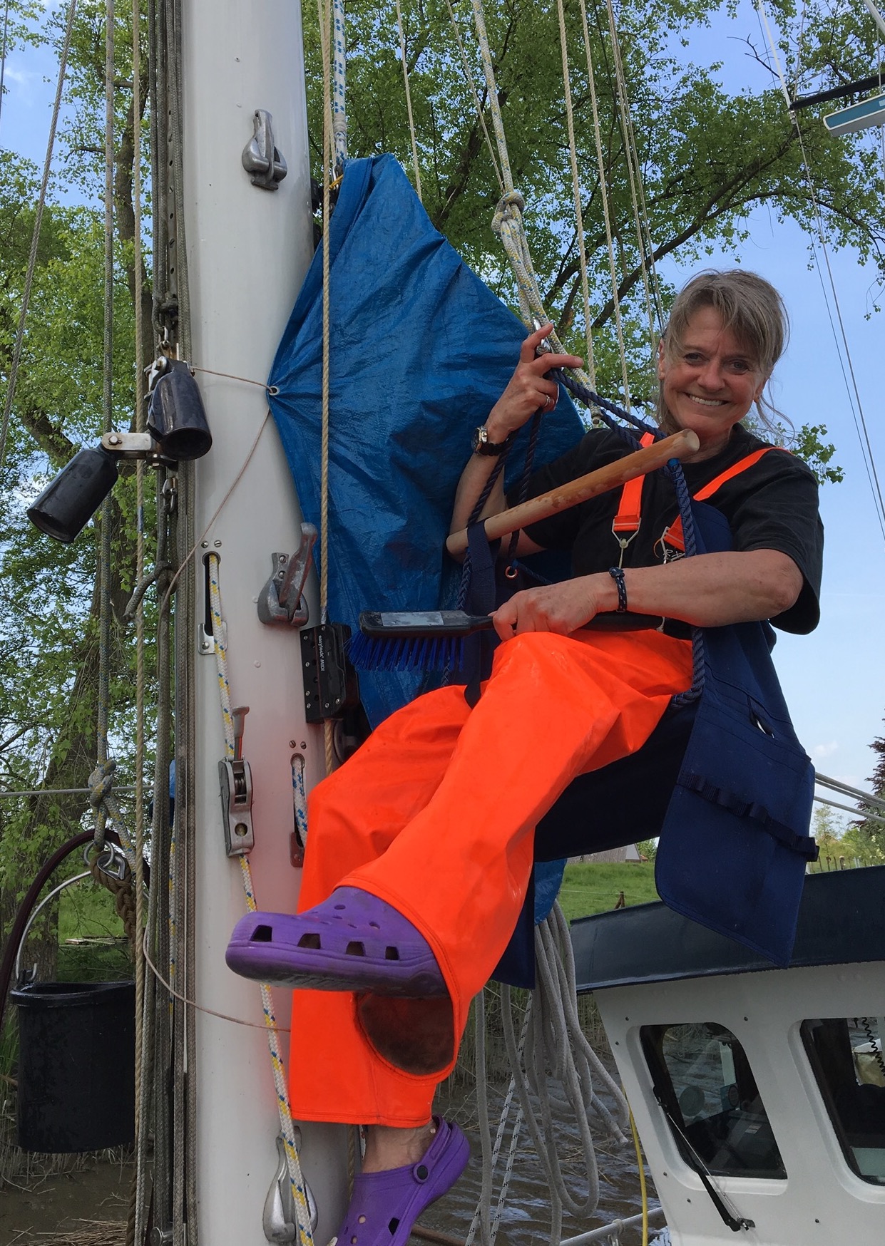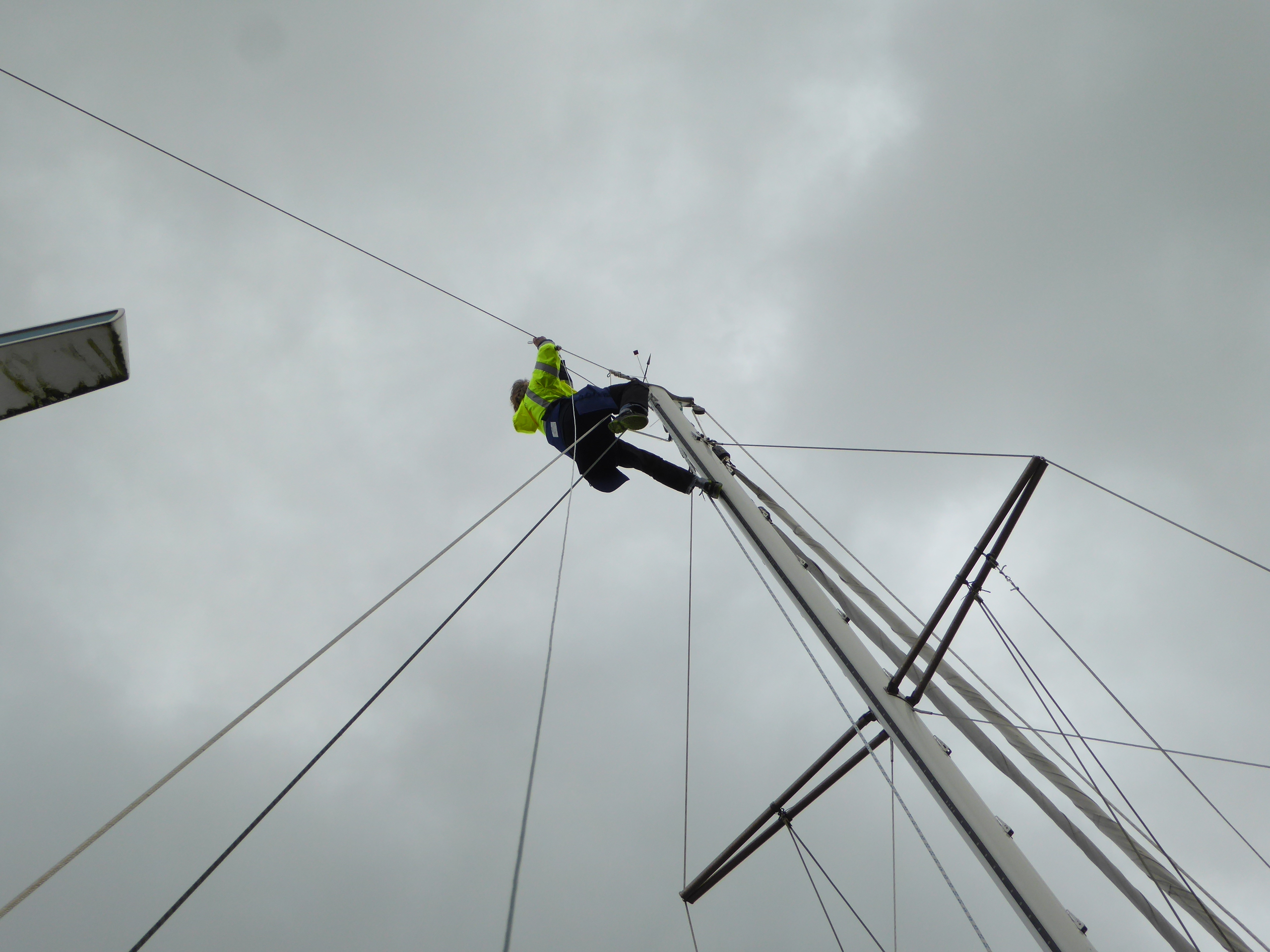 Oberndorf. Schon seit Jahren wollten wir den Mast mal von oben bis unten waschen. Das hat Leni jetzt gemacht. Wie immer, schick mit Ocean Regentoi, dem alten dänischen Fischer Ölzeug.