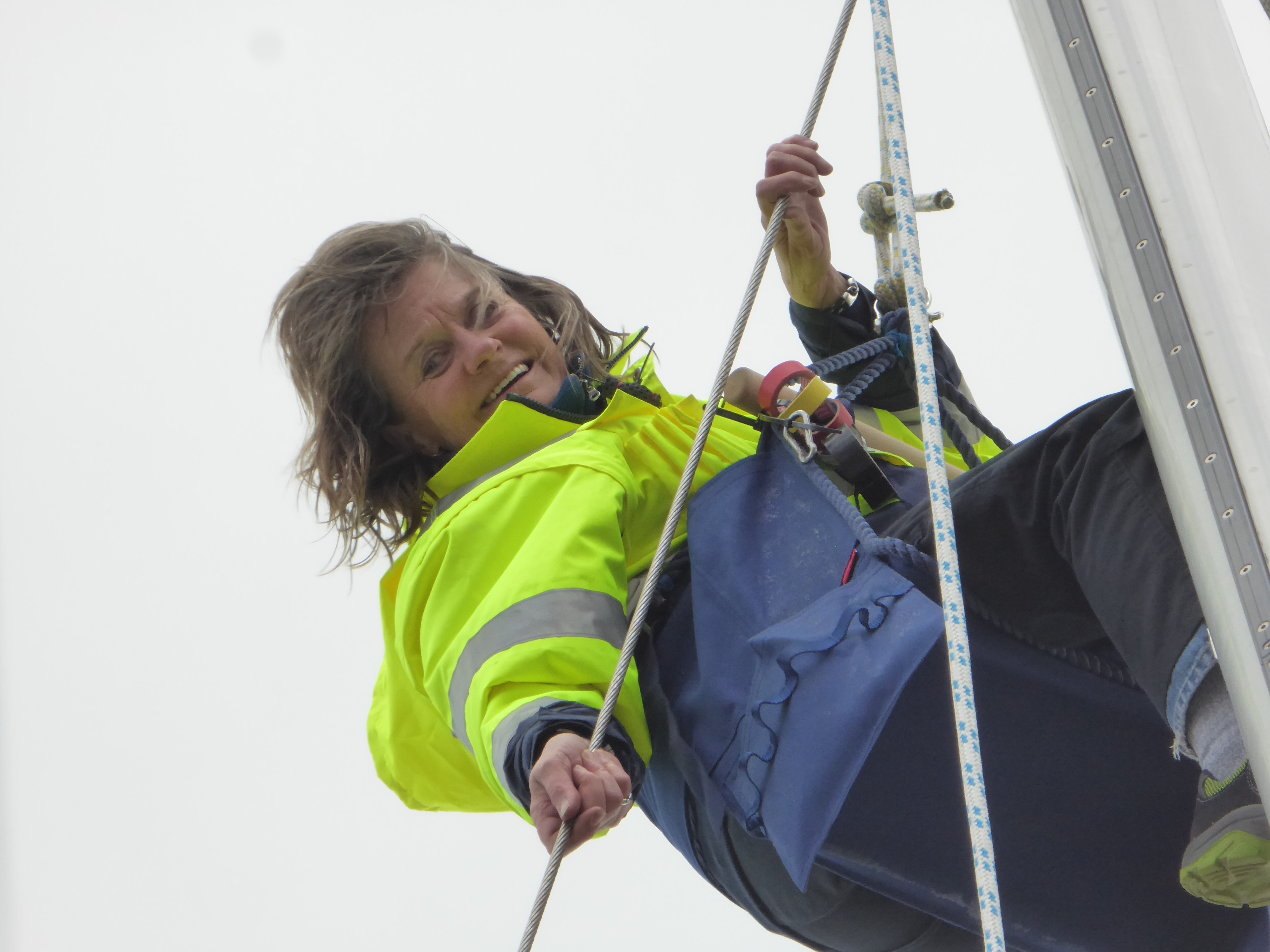 Oberndorf. Meine Maschinistin montiert eine neue Kurzwellenantenne, 16 m hoch, Regen, 6 Windstärken, 6Grad und: sie strahlt! Das ist Marlene! Sea U Bert