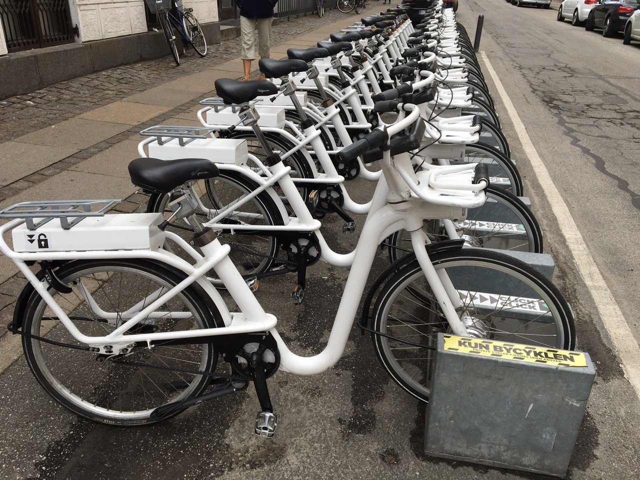 Kopenhagen. Miet E Bikes mit großem Navi Bildschirm. Kosten etwa 25 Kronen, knapp 3€ pro Stunde. Es gibt unglaublich viele Fahrräder in Kopenhagen. Über die neue Brücke, fahren täglich 8000. Sea U Bert