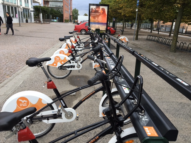 Malmö. Überall in der Stadt solche Fahrradständer. Nachdem sie sich die Zugangskarte besorgt haben können die Malmöer für nur 250Kronen ( 25€) die Fahrräder ein ganzes Jahr nutzen.