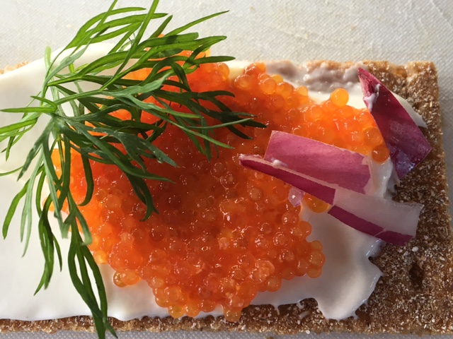 Simmrishamn. Leuram (Schreibweise unklar) ist die typisch schwedische Vorspeise aus Steinbeisserrogen, Zwiebel, Creme fraiche und Dill auf Knäckebrot. Gabs heute auf der Heimkehr.