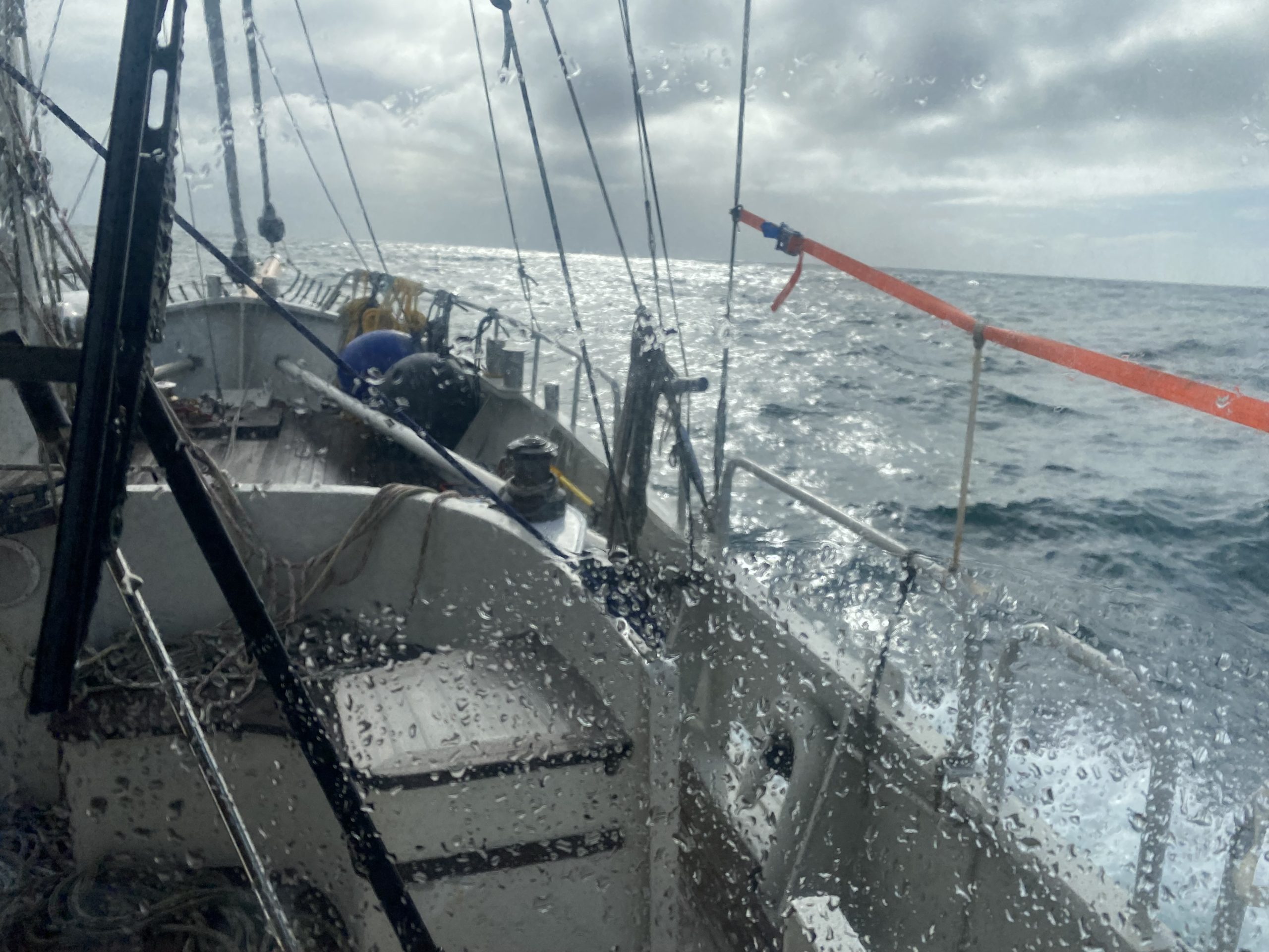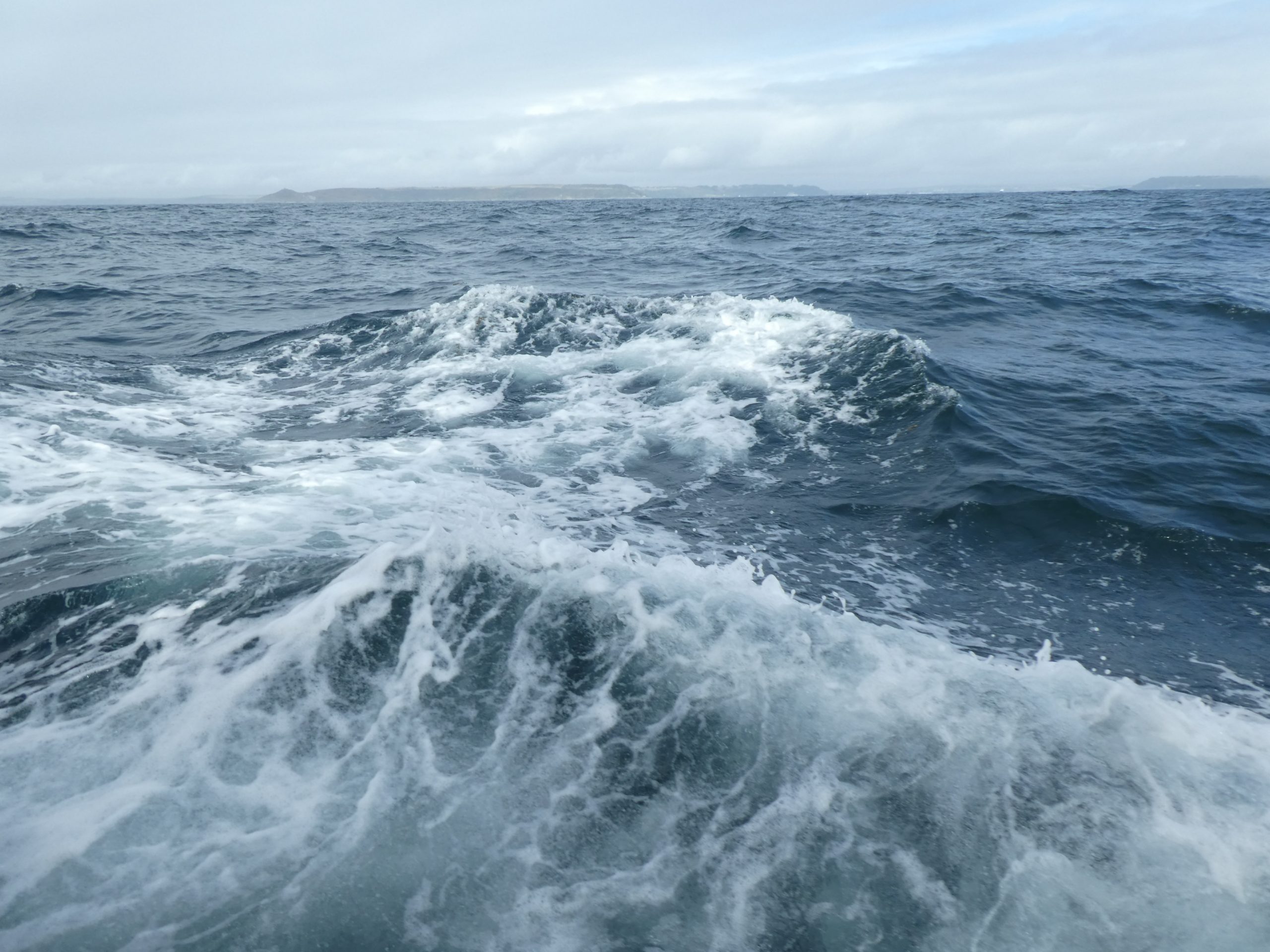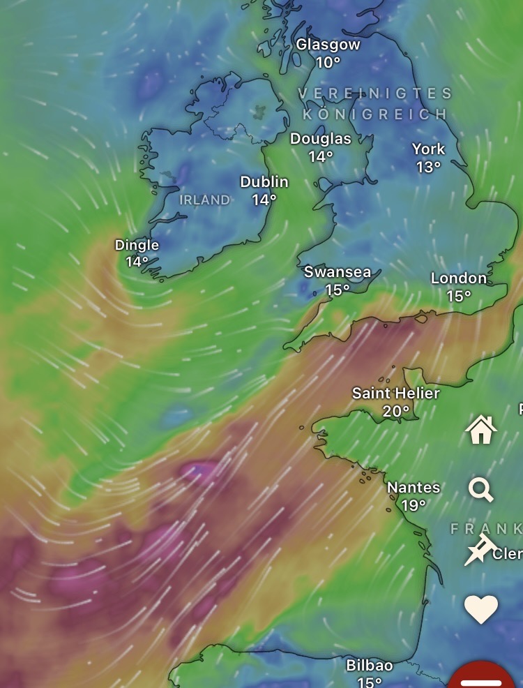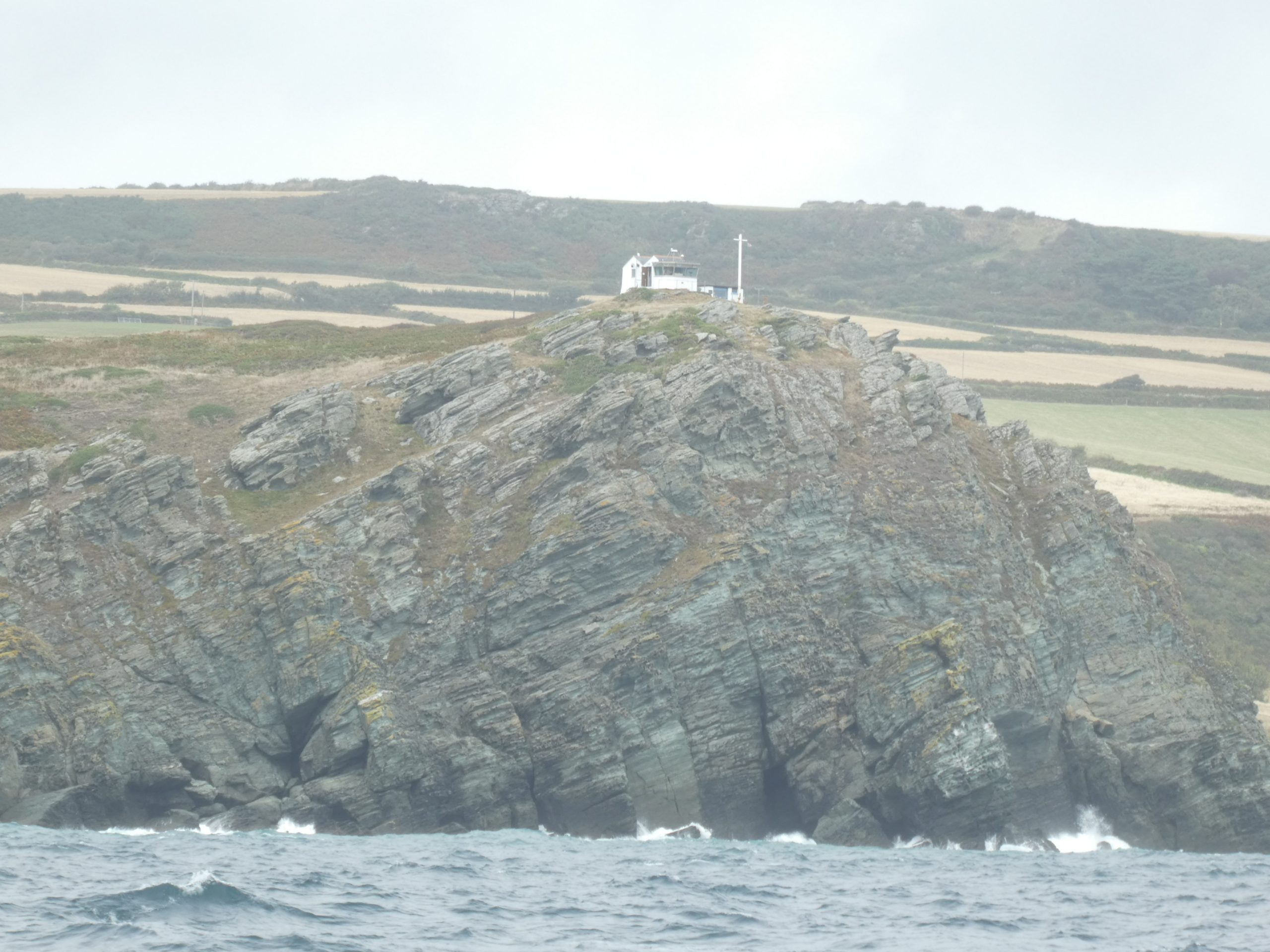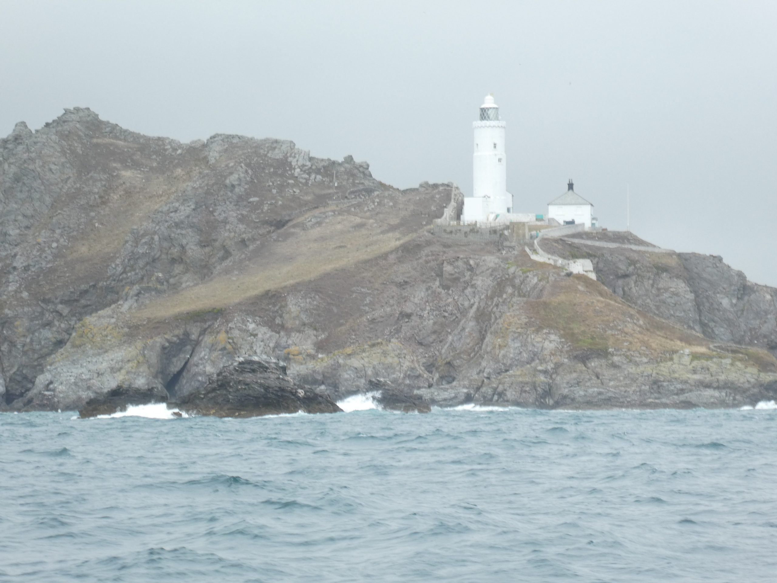 Wir sind früh in Fowey ausgelaufen, bei Regen und mehr Wind, als vorhergesagt war. Wir setzen das Großsegel noch am Pontoon, verstauen schnell Fender und Leinen. Dann geht es auch schon los: in der Ausfahrt haben wir eine giftige See, wir schätzen 2,50 m! Das hat der Wetterbericht uns verschwiegen. Heimkehr nimmt die Brecher gelassen, die Crew eher weniger. Die Diskussion, ob wir umdrehen sollen, gewinnt der Skipper. Seine Vermutung, dass die Seen weiter draußen nicht mehr so hoch sind, ist richtig und wir segelmotoren Richtung Osten. Die Tiden-APP hat richtig gerechnet, wir haben mitlaufenden Strom, der uns tüchtig schiebt. Zum Glück haben wir uns morgens Sandwiches gemacht (for later) und keiner muss unter Deck in die Pantry bei dem Gewackel.