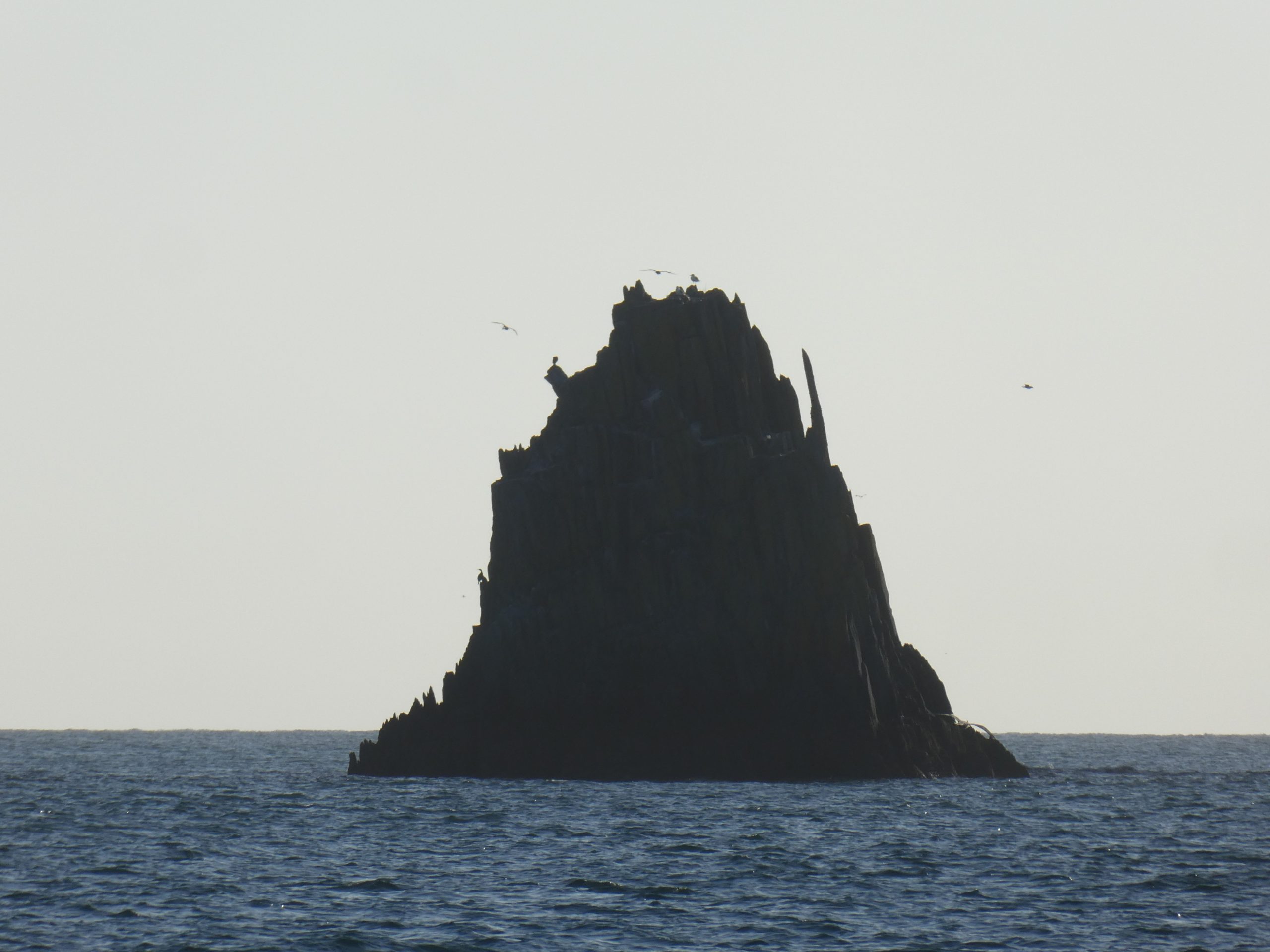 Bizarre Felsen im Gegenlicht und ein Seezeichen, ein Daymark, oben auf den Klippen.