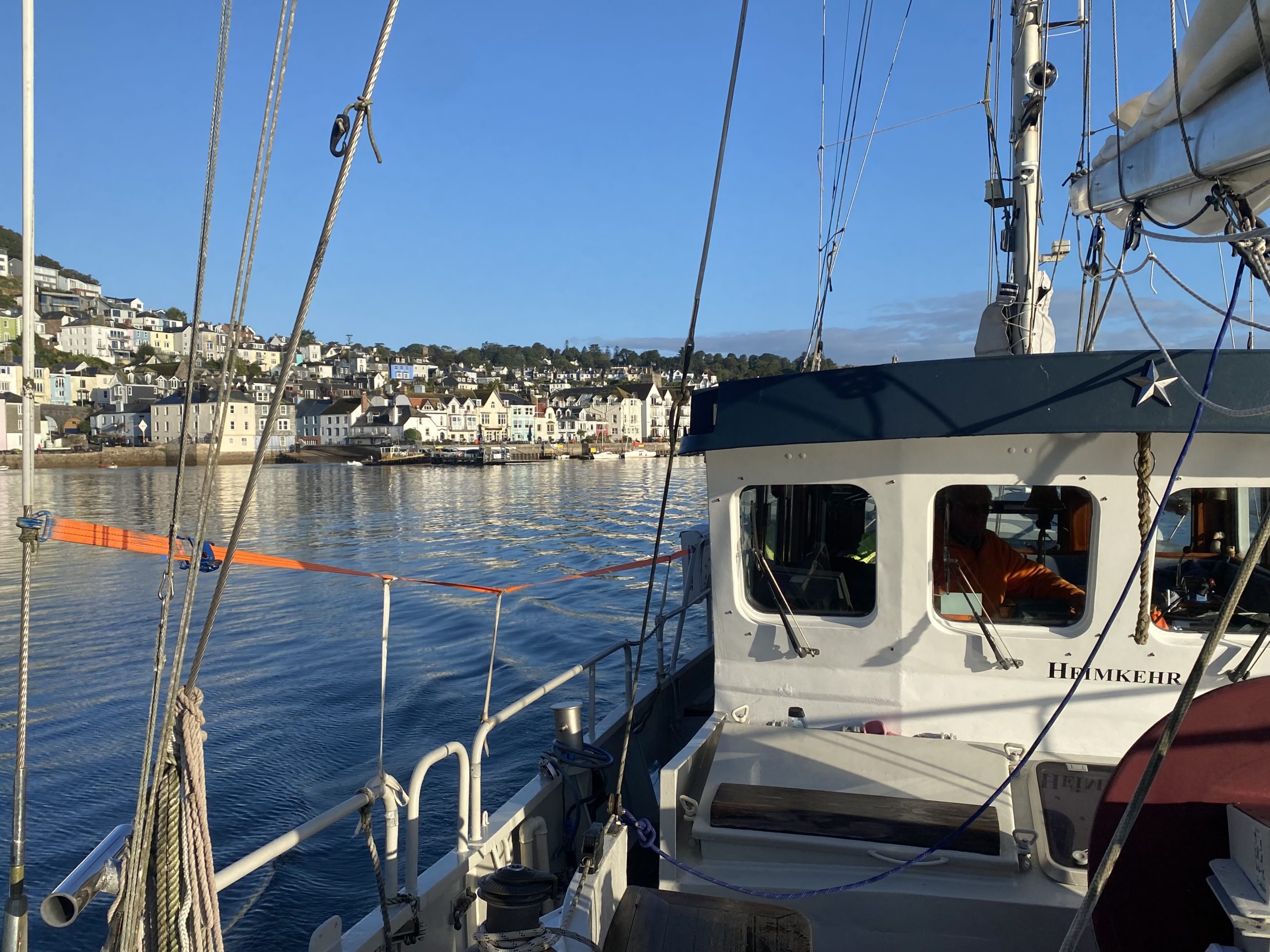 Früh ausgelaufen in Dartmouth bei schönstem Wetter. Das Ablegen vom Pontoon mit starker Strömung war nicht einfach. Der River Dart schiebt uns mit Kraft in den Englischen Kanal. Erst kommen wir gut voran. Wenig Wind, wenig Welle, also wieder mal segelmotoren. Der Strom kentert und wir haben ca. 0,5 Knoten Strom gegen uns. Der wenige Wind kommt von achtern, da haben wir dann Strom gegen Wind. Dadurch wird es etwas holprig, aber gut erträglich.