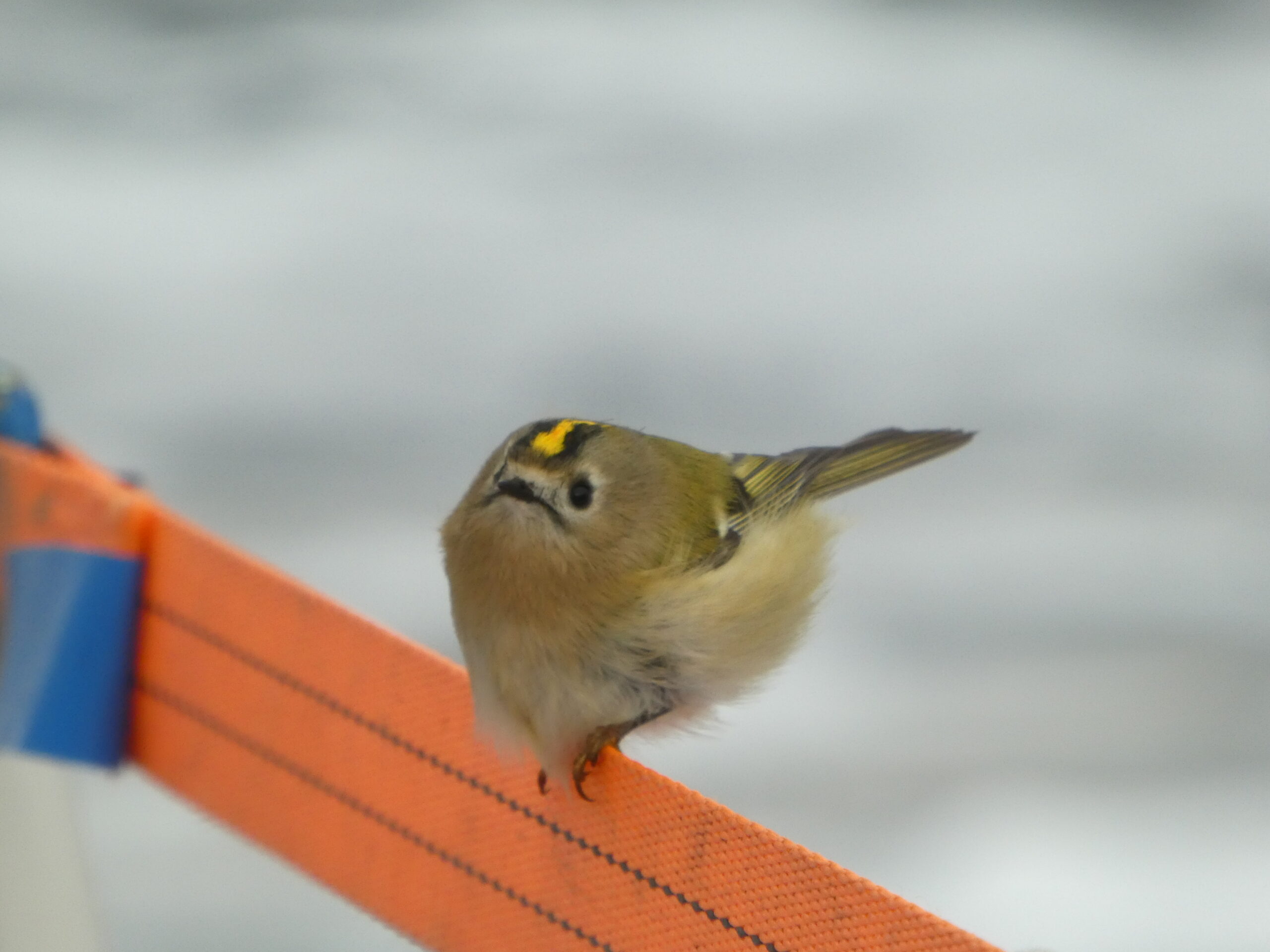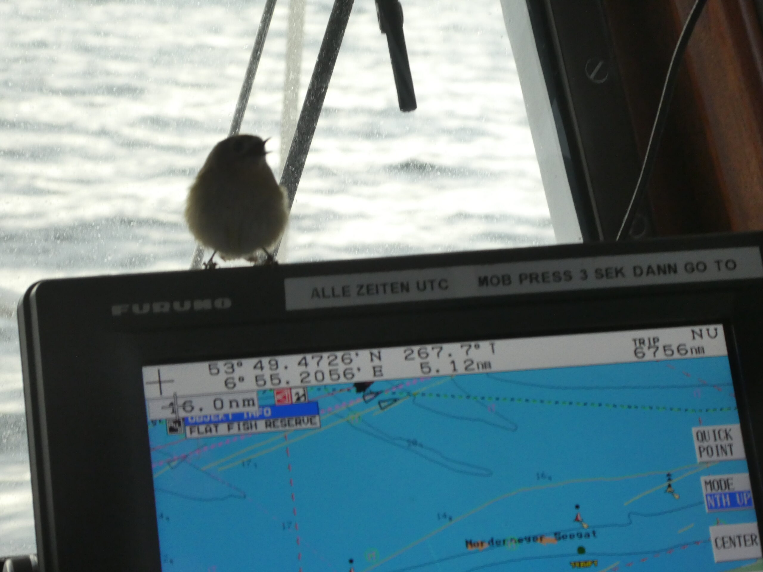 Das Goldhähnchen will wohl auch nach Helgoland. Auf jeden Fall macht er erstmal eine Pause bei uns an Bord und überprüft auf dem Kartenplotter den Kurs.