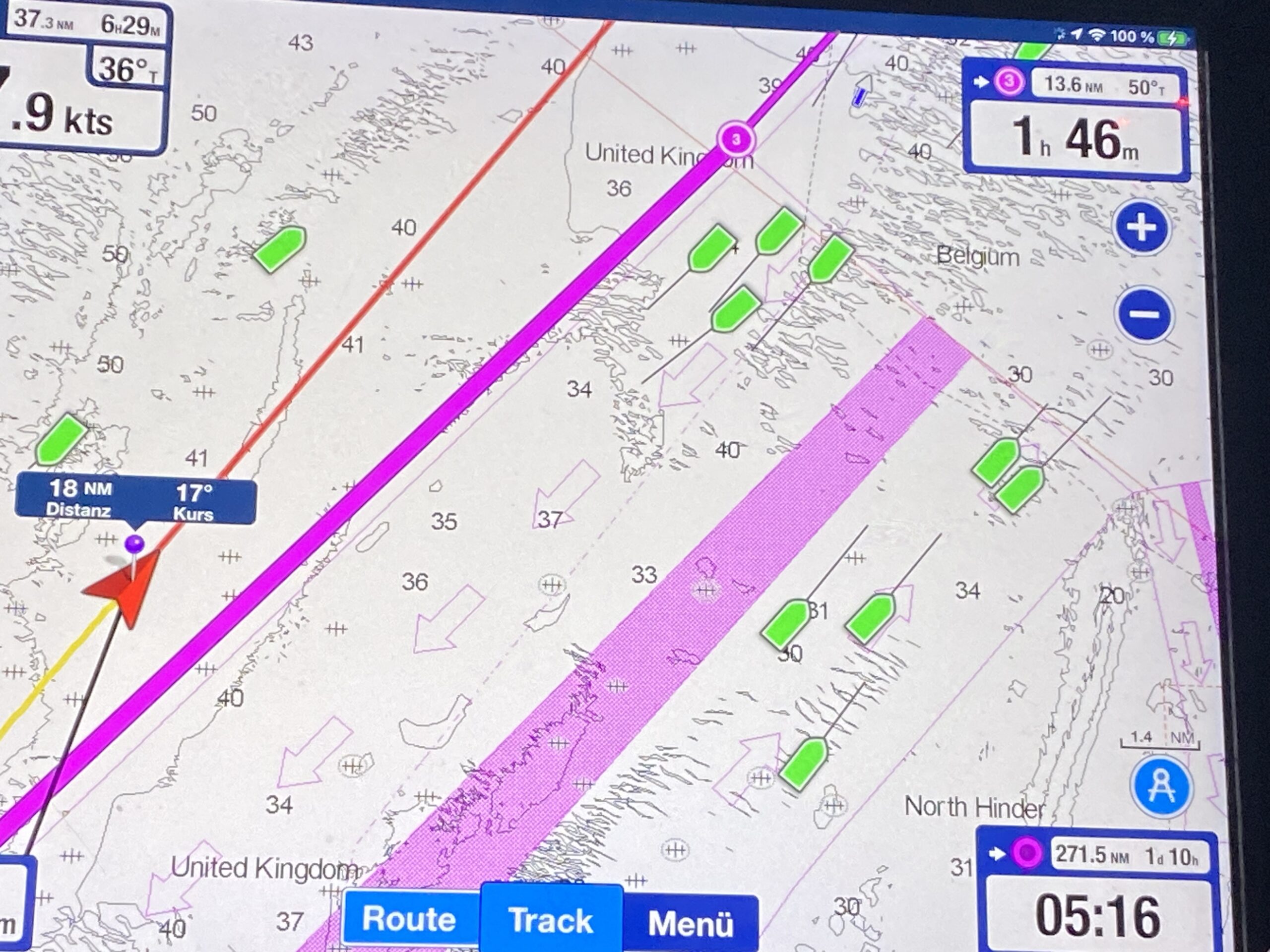 Auf dem Weg von Ramsgate nach Helgoland ist viel Schiffsverkehr. Wir halten uns sehr streng an die Regeln bezüglich der Verkehrstrennungsgebiete. Entweder fahren wir, wenn es möglich ist, außerhalb der sogenannten Fahrbahnen, oder innerhalb der vorgeschriebenen Fahrtrichtung am rechten Rand, um die Großschifffahrt nicht zu behindern. Das ist besonders nachts eine sichere Möglichkeit, keinen Gegenverkehr zu haben. Heimkehr ist das rote Dreieck links.