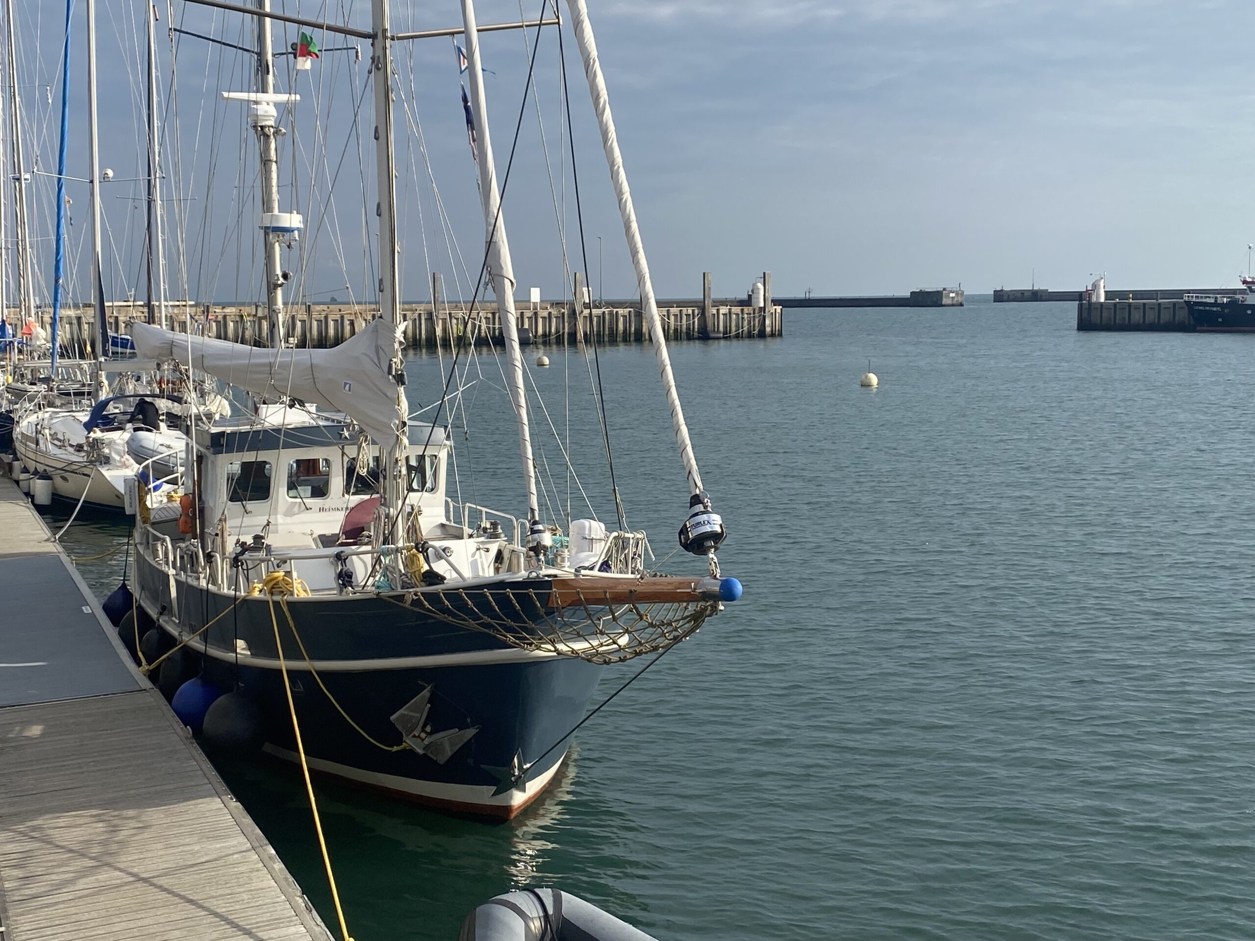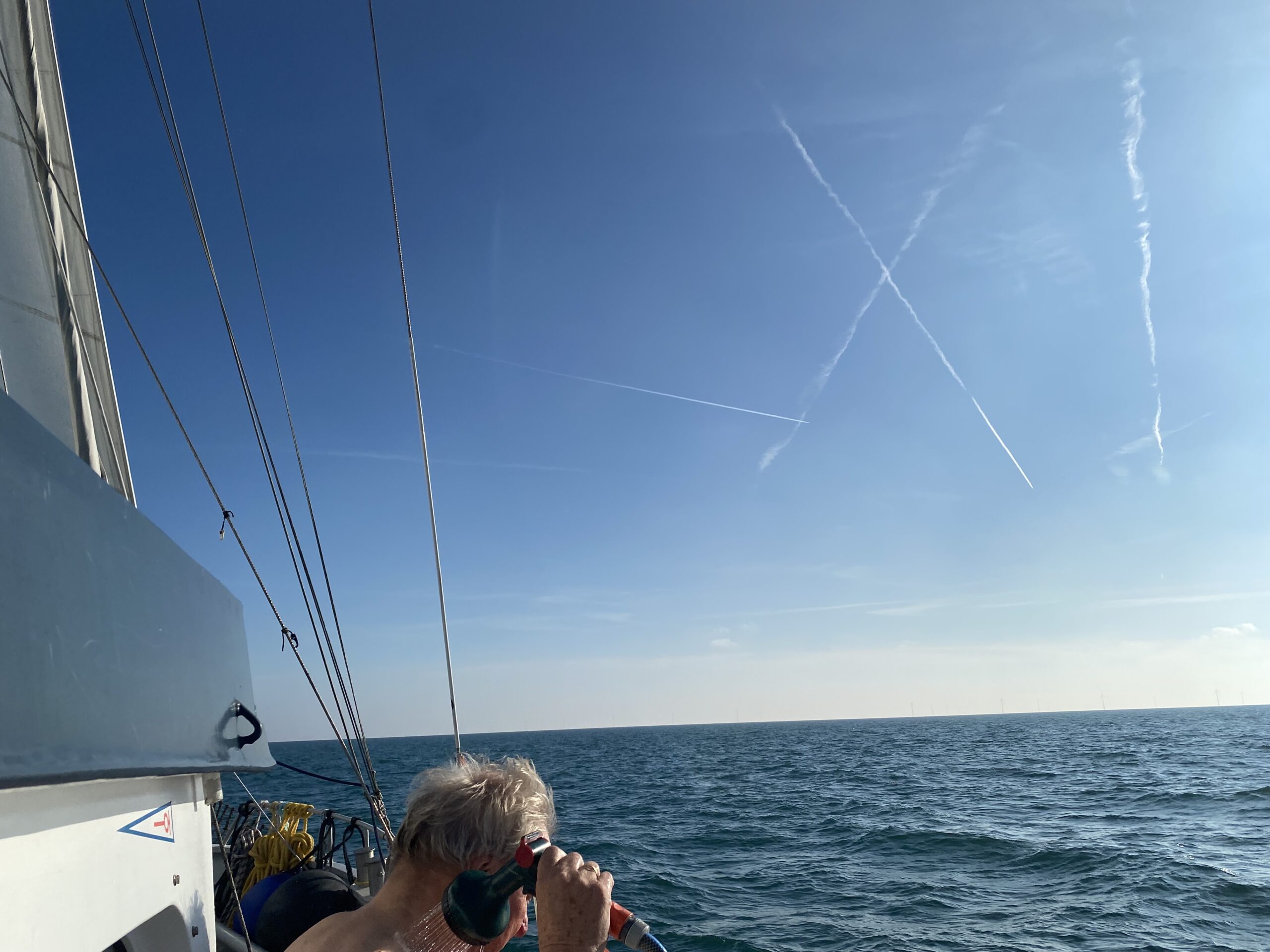 Nach einer Woche Ramsgate tut sich ein Wetterfenster auf und wir laufen aus. Ca. 320 Seemeilen liegen vor uns, wir rechnen mit 2,5 Tagen bis Helgoland. Das Wetter ist friedlich. Das bedeutet, zu wenig Wind, um nur zu segeln. Trotzdem setzen wir Klüver, Groß und Besan und lassen eine Maschine (am ersten Tag Olaf, später wechseln wir auf Jan) mitlaufen. Die am Anfang mitlaufende Tide schiebt uns voran, etwas Wind ist in den Segeln.