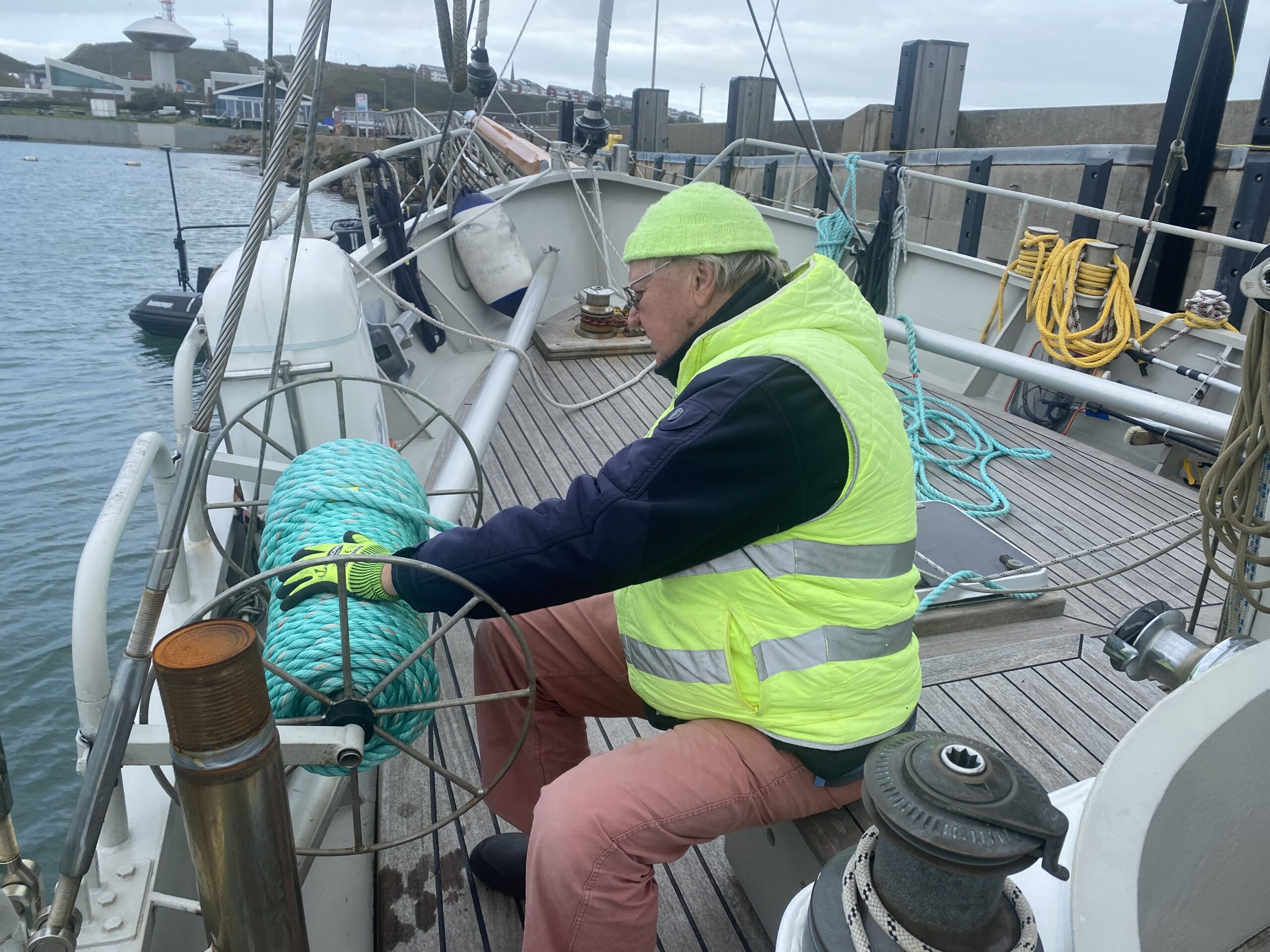 Der Sturm ist vorbei, die See um Helgoland hat sich beruhigt. Wir räumen schon mal die Sturmleinen weg, rollen die langen Landleinen wieder auf die Trommel.