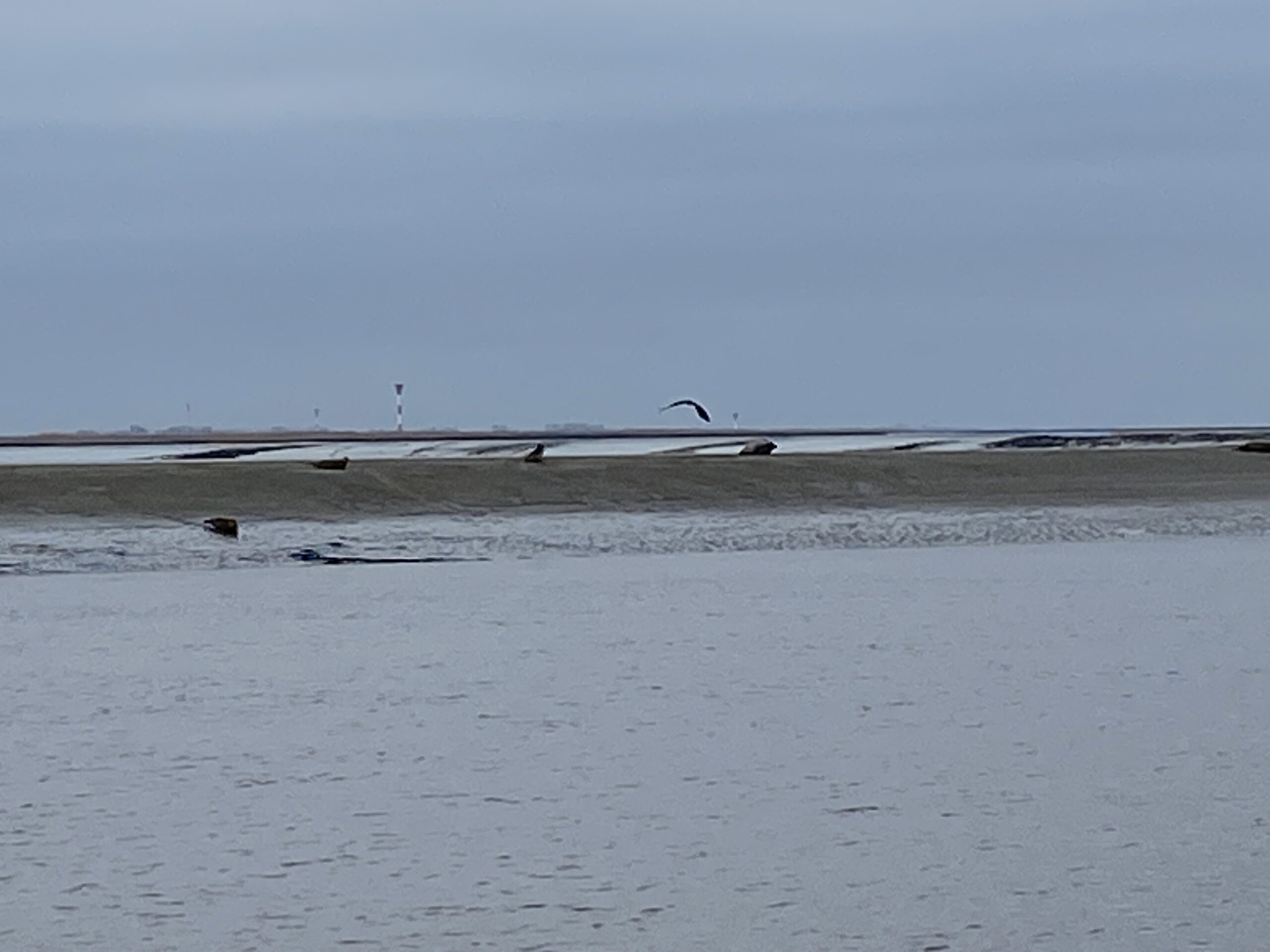 Seehunde und ein Fischadler teilen sich die Sandbank.