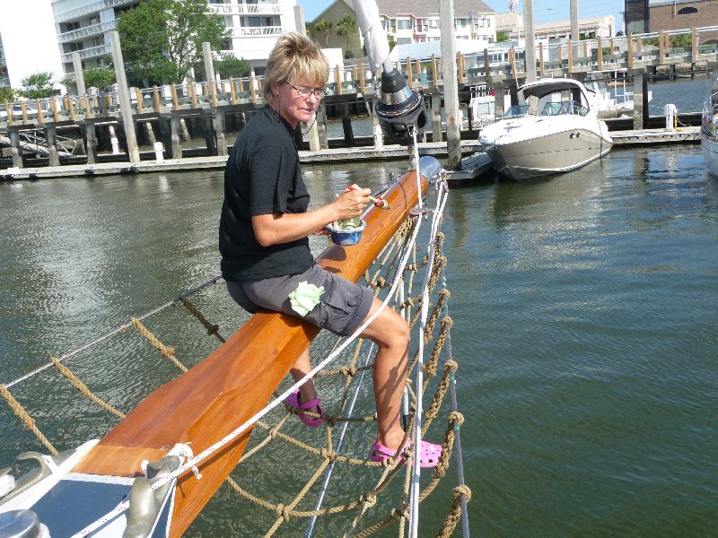 Charleston, South Carolina, USA. Macht schon Spaß, so mitten in einer der schönsten amerikanischen Städte zu liegen. Wir haben viele Freunde hier. Aber etwas Arbeit gibt’s auch. Die Naturholzteile müssen dringend lackiert werden, die Sonne frisst sonst alles auf. Morgen machen wir ‘ne kleine Party mit hiesigen Freunden. Da es Bilder bei der Arbeit immer nur von Leni gibt, möcht ich vermelden, dass ich gestern die Klo Schläuche gereinigt habe. Schöne Arbeit. Leni malt. Als ich meiner frechen Tochter erzählt habe, dass Leni im Maschinenraum werkelt, sagt sie: Tja, artgerechte Haltung! Sea u Bert