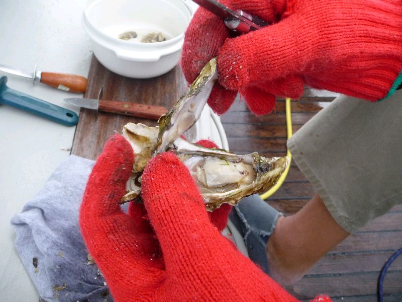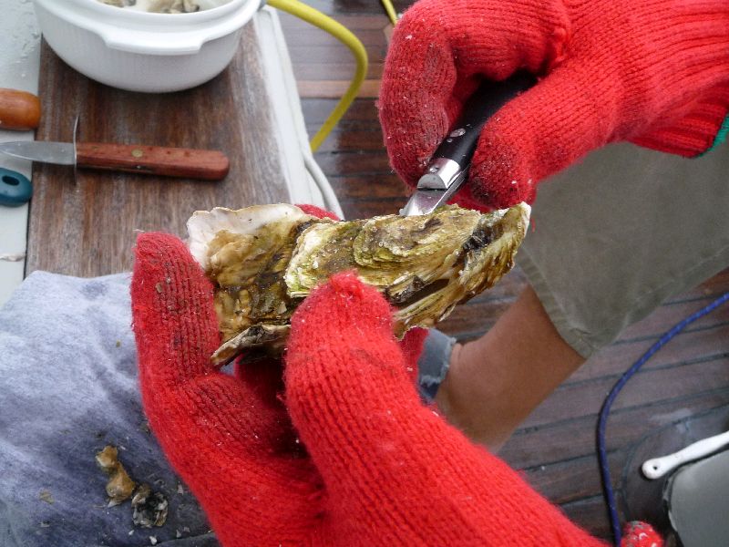 Camaret. Wie schon berichtet, haben wir Austern gebraten. Eigentlich isst man die ja roh, aber Leni ist dazu noch zu klein. Das kommtr davon, wenn man mit so jungen Dingern segelt. Falls Ihr’s denn unbedingt auch mal probieren wollt: Mit dem Austernmesser, von denen ich eine ganze Sammlung an Bord habe, am Scharnier eistechen, aufhebeln und flach unter dem Deckel langschneiden. Aufklappen und das Fleisch rausschneiden. Schalenkrümel heraussammeln oder spülen. Abtrocknen und mit Mehl bestäuben. In Öl mit etwas Knoblauch ein bis zwei Minuten von jeder Seite braten. Etwas Zitrone drüber. Dazu eine ca. 2,5 cm dicke Scheibe Toast oder Baguette. Guten Appetit. Für zwei Personen drei Kilo Austern (viel Abfall). Sea u Bert