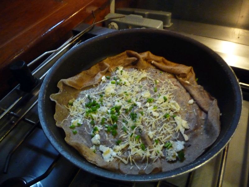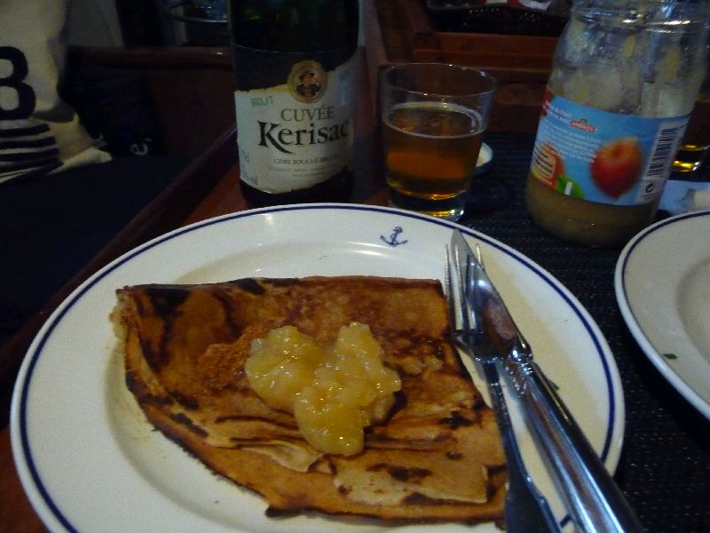 Die Biester sind doch zu lecker. Hauchdünn, 6 Stück kosten 2,40 €, werden in der Pfanne angebraten und mit ‘was Du willst’ gefüllt. Dann zusammengeklappt und fertig. Es gibt sie aus hellem Mehl und dunklem. Ble noir. Die letzteren sind die herzhaften. Die gibt’s bei uns immer zuerst. Dann die hellen mit Apfelmus und Zimt + Zucker. Dazu Cidre. Kommt meiner wieselflinken Schnellküche sehr entgegen. Sea u Bert