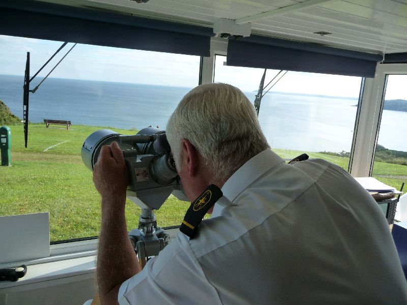 Polruan, Cornwall. Gegenüber von Fowey hoch oben auf der Klippe ist das National Coastwatch Station. Davon gibt es 44 in England, die von freiwilligen Helfern betrieben werden. Mit Radar, AIS und superstarken Ferngläsern (in diesem Fall von einem Wachturm der NVA) wird die Schiffahrt beobachtet und registriert. Es wird festgehalten, wie das Schiff heißt und wo es herkommt, wieviel Leute an Bord sind und ob sie Schwimmwesten tragen. Und nachdem wir durch das große Fernglas die Heimkehr betrachtet haben, duschen wir morgen wieder mit Badehose an Deck.