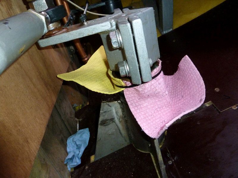 Nun wird’s technisch. Die Ruderwelle steckt in einer Nylonbuchse, die Abdichtung ins Schiffsinnere erfolgt mit einem Simmering. Durch diesen Simmering ist eine kleine Menge Wasser eingedrungen. Leider ist das obere Ende des Kokers unter der Wasserlinie. Über einen Schmiernippel haben wir unter ständigem Ruderlegen Fett in den Koker gedrückt, der den Simmering und die lange Buchse schmiert. Durch den Druck des Fettes von unten und des Wassers von außen werden die Dichtlippen des Simmerings angepresst. Alles dicht. Der Simmering zeigt auch keine Auffälligkeiten, alles rund und glatt. Um den Koker oben haben wir mit Kabelstraps zwei Küchenschwammtücher gebunden. Die können wir mit einem Blick durch die Inspektionsluke sehen und sofort erkennen, ob sie nass sind. Kleinstmengen würden die Tücher aufnehmen und verdunsten lassen. Sollte es erneut lecken, läuft das Wasser in die Stopfbuchsenbilge der Backbord-Maschine, diese entwässert in einen Kanister in der Bilge und darin steckt ein Wasseralarmgeber. Hosenträger und Gürtel also. Wir haben entschieden, so weiterzusegeln. Sea u Bert