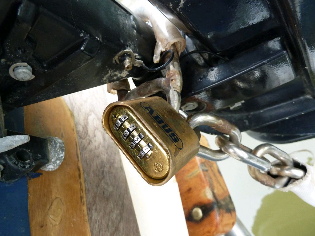 Zahlenschlösser. Es gibt von Abus ein seewasserfestes Zahlenschloss, bei dem man eine Kombination einstellen kann. Sogar in USA war das zu bekommen. Auf so einer Reise muss man immer wieder was anschließen. Das Beiboot zum Beispiel. Wir haben im Boot eine 6 mm Nirokette und ein solches Zahlenschloss. Ein verlorener Schlüssel wäre fatal, wenn das Schiff vor Anker liegt. Im übrigen haben wir festgestellt, dass andere Schlösser zwar wasserfest sind, die Schlüssel aber hemmungslos rosten. Sea u Bert