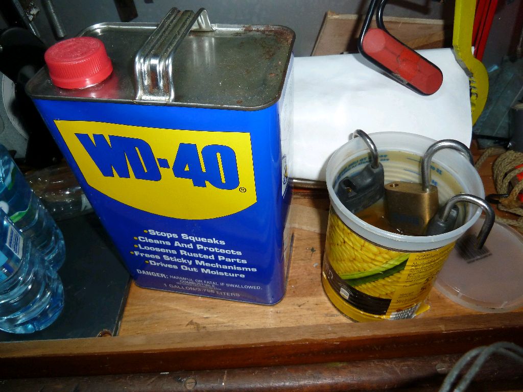 WD 40 Bad. Ja richtig gelesen, Bad nicht Spray. Das bei Seglern wie Kleingärtnern bestens bekannte Antiquietsch- und Rostmittel gibt es nicht nur als Spray, sondern auch im Kanister. Dazu ein Schraubgefäß (Gurkenglas). Zum Beispiel ein Vorhängeschloss oder eine schwergehende Zange wird 2 Tage ins Bad gesteckt, dann einen Tag abtropfen und: kein Quietsch, kein Rost, alles fein auf lange Zeit. Sehr empfehlenswert. Sea u Bert