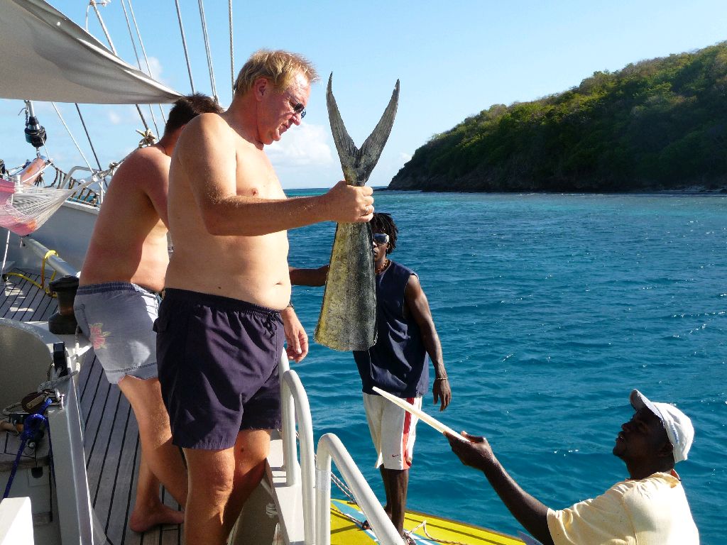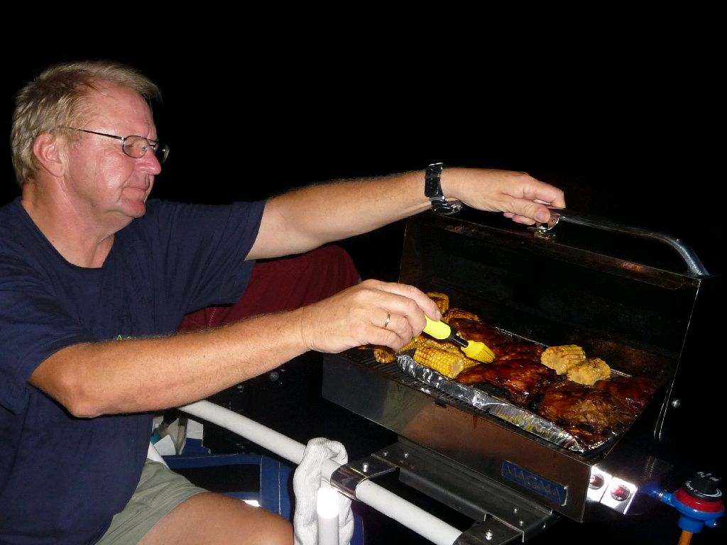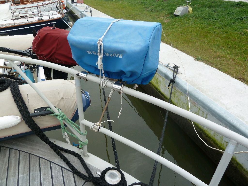 Grill. Unter dieser Persenning verbirgt sich ein Gasgrill. Die kleine Extra-Gasflasche steht an Deck. In den warmen Regionen ersetzt der sehr häufig die Küche. Selbstgefangenes oder von den Boatboys gekauftes Meeresgetier lässt sich hier draußen wunderbar zubereiten (Thüringer Bratwurst geht auch gut). Und der Geruch ist nicht im Schiff. Der Grill war die ganze Reise über an der Heckreling befestigt und hat sich dort auch bei schlechtem Wetter nicht weggerührt. In Gedanken an einen (F)risch gegrillten Mahi Mahi: Sea u Bert