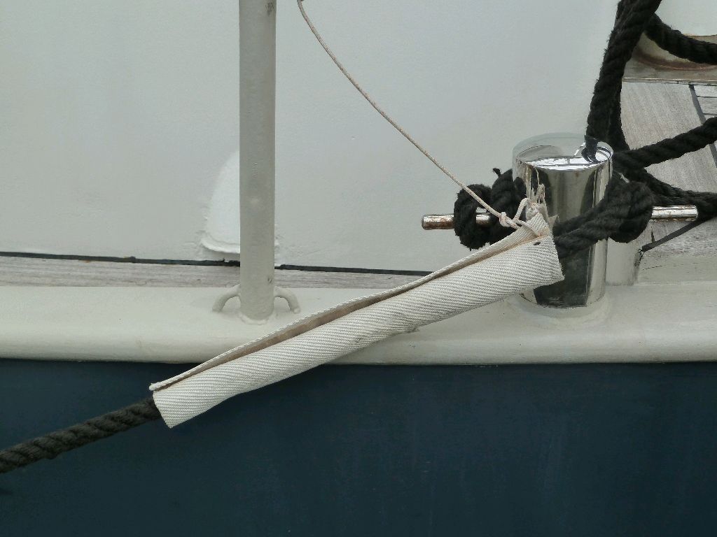Schamfilschutz. Auf der langen Reise unverzichtbar, wenn man nicht gerade ‘ne Freundin in der Tauwerkfabrik hat. Die Atlantikhäfen haben oft erheblichen Schwell. Dort kann ein zölliger Festmacher in zwei Stunden durch sein. Die Schwell-Spitzenreiter waren Madeira, die Azoreninsel Flores und auch New York City. Bis zu 12 Leinen mit Schamfilschutz und Ruckdämpfern haben wir gebraucht, um die Dicke an der Pier im Zaum zu halten. Die größten Sorgen haben uns dabei die Poller und Klampen auf der Pier gemacht. Diesen Schutz hier haben wir bei Toplicht in Hamburg gekauft. Tolles Ding, mit Klettverschluss. Gut sind auch dünnere Feuerwehrschläuche, die man aber vorher über die Leine ziehen muss, was manchmal schwierig ist. Sea u Bert